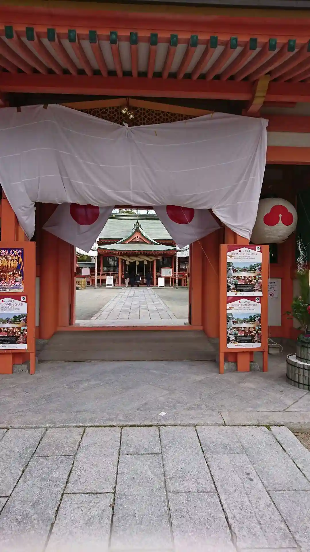 <神門>全景。中央上部のセンスの良いお洒落な<干支絵馬>と可愛らしい<提灯>が気になる。(o^―^o)