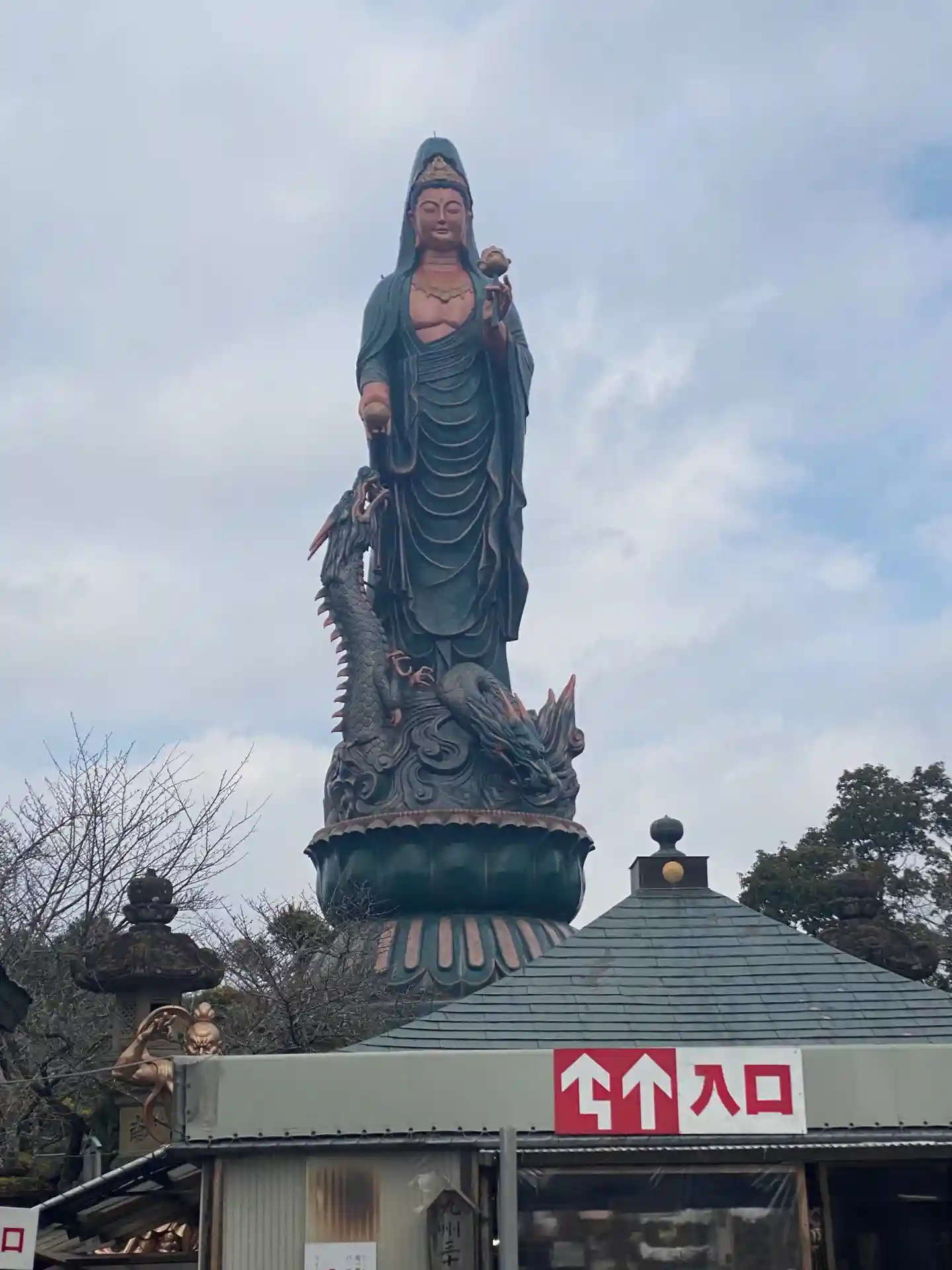 山の頂きにあり、昇龍をお供に立つ立派な観音様です。