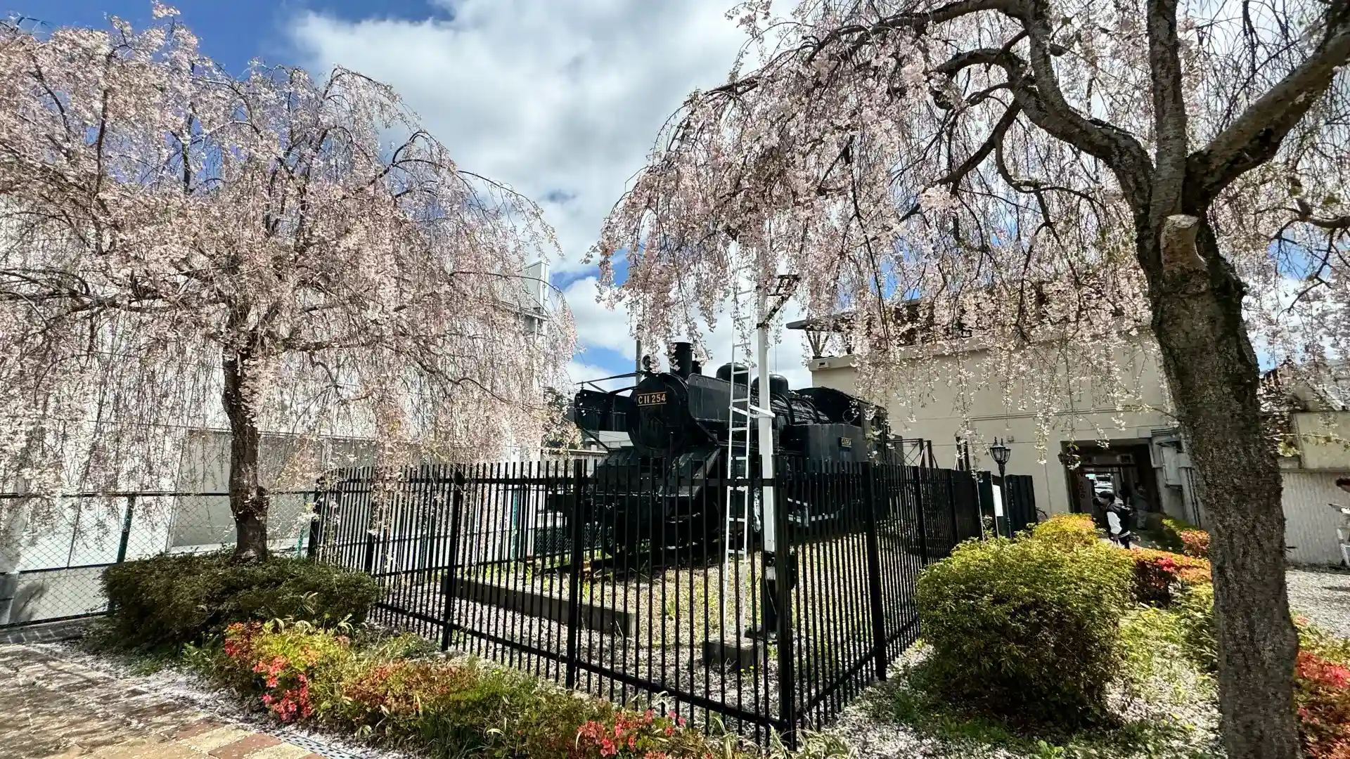会津田島駅そばに物々しく建ち、かつ桜との取り合わせが絶好の観音堂。隣のC11 254号機と合わせて、桜が映える写真スポット。