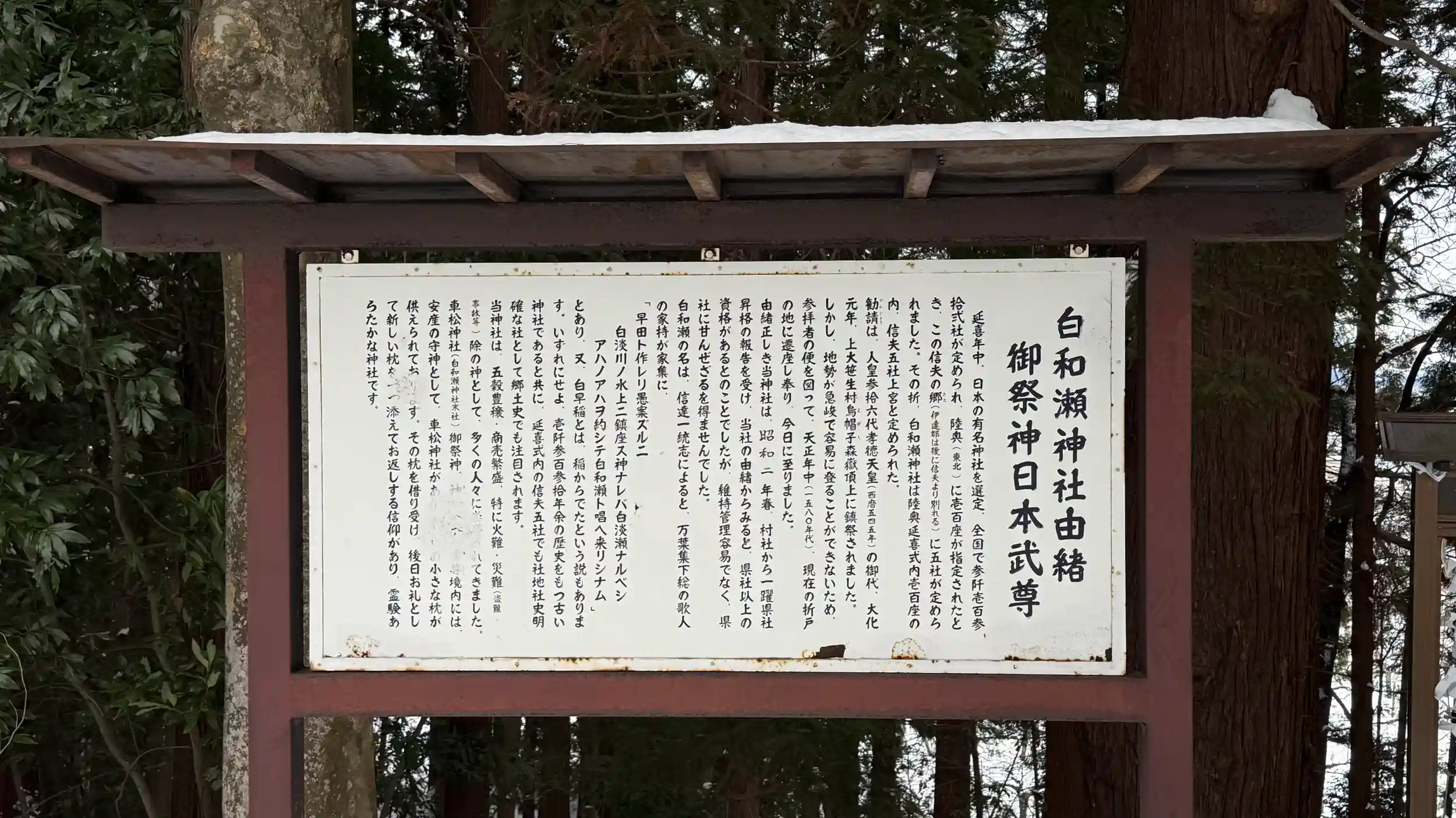 延喜年中(901~923)、日本の有名神社を選定、全国で3132社が定められ、陸奥(東北)に100座が指定されたとき、この信夫の郷(伊達郡は後に信夫より別れる)に5社が定められました。その折、白和瀬神社は陸奥延喜式内100座の内、信夫五社上宮と定められました。