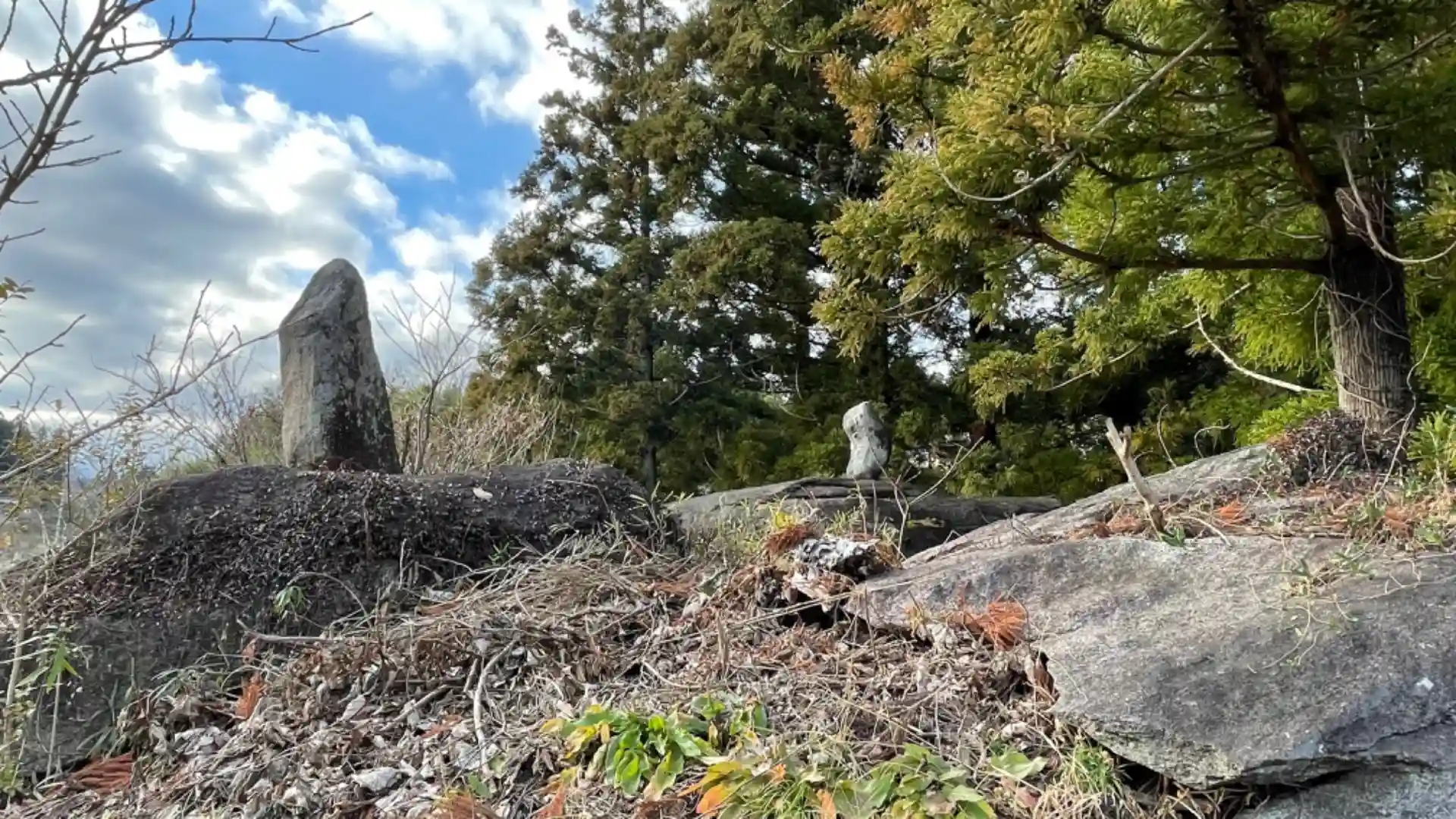 大きな岩の上に石碑が二つあります。