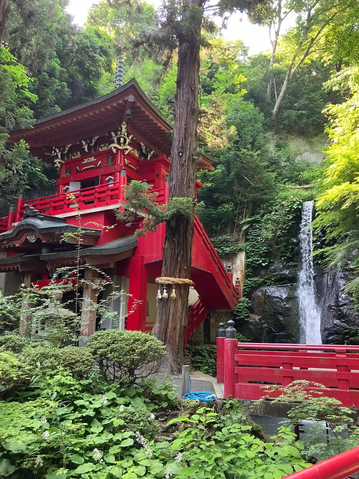 自然の中にある赤い建物と滝、洞窟の中にはたくさんの仏像があり、とても素敵でした。