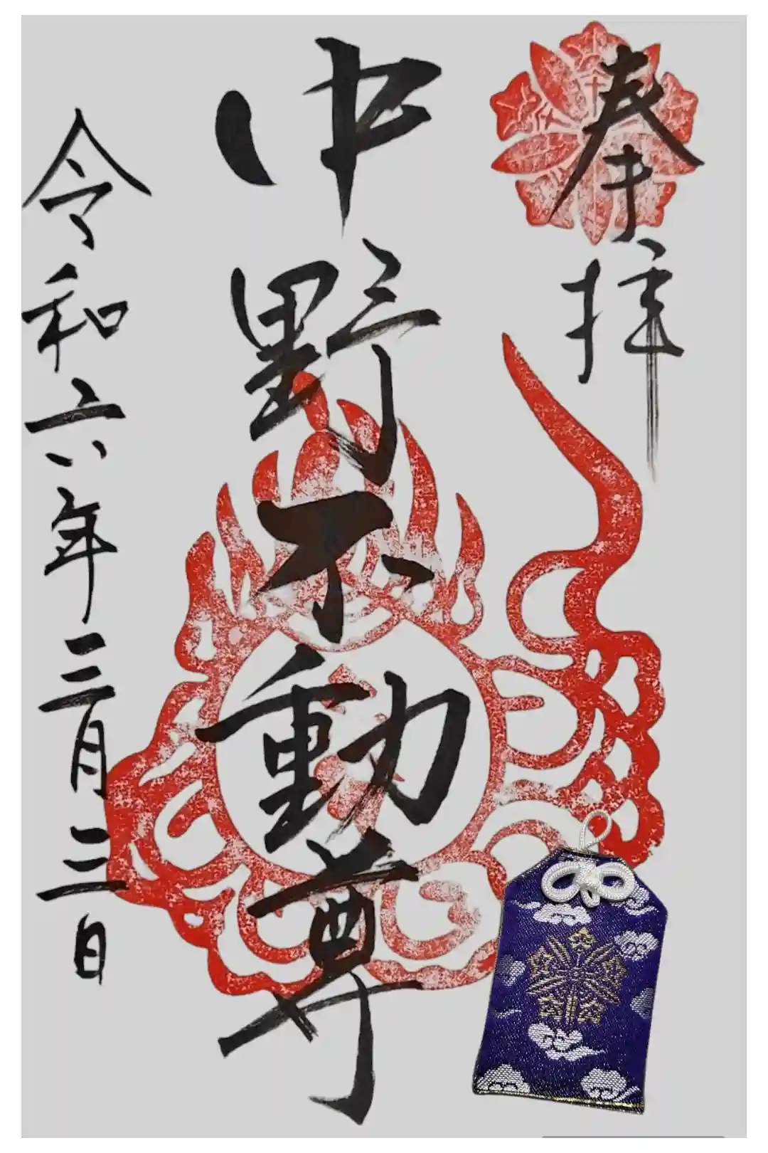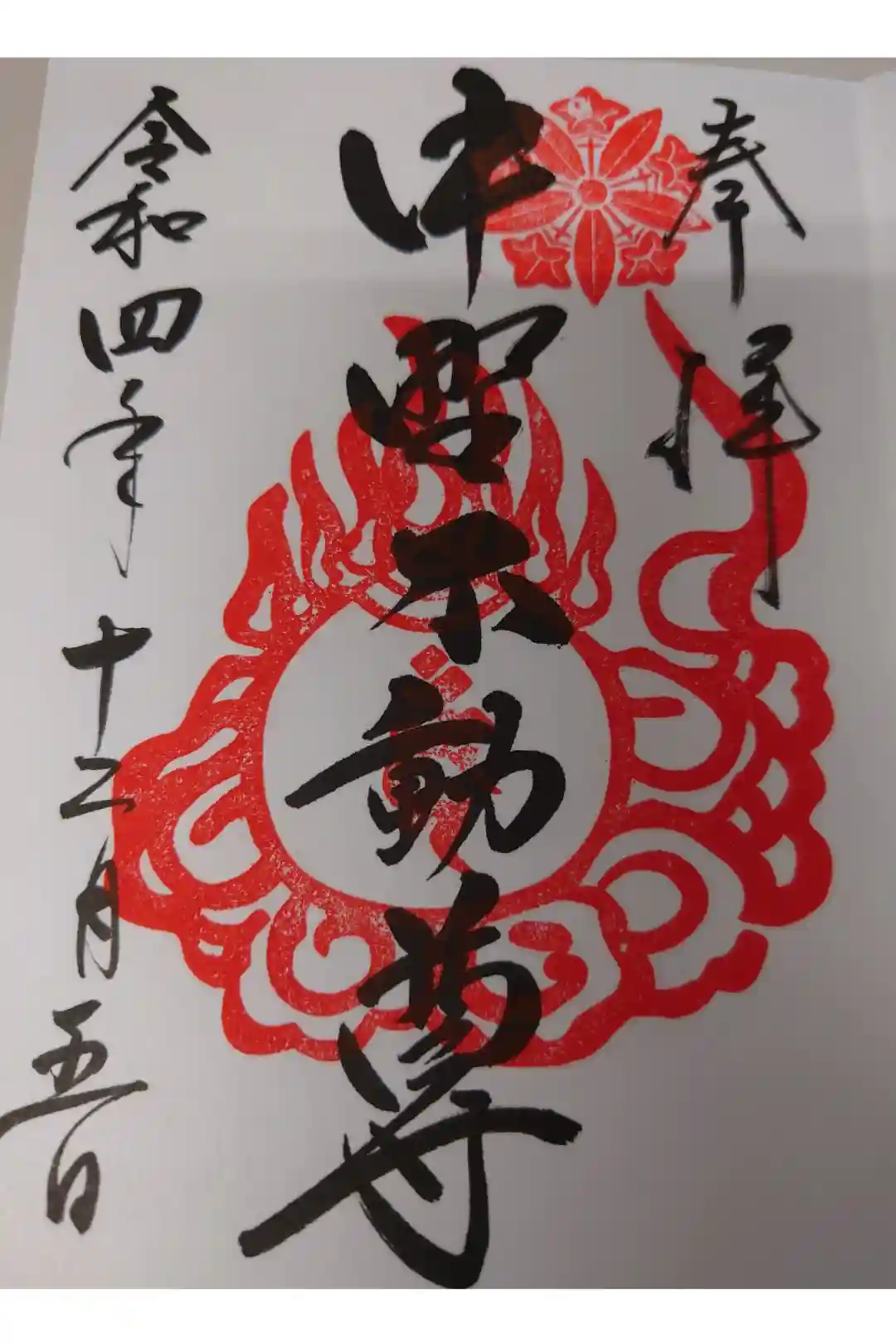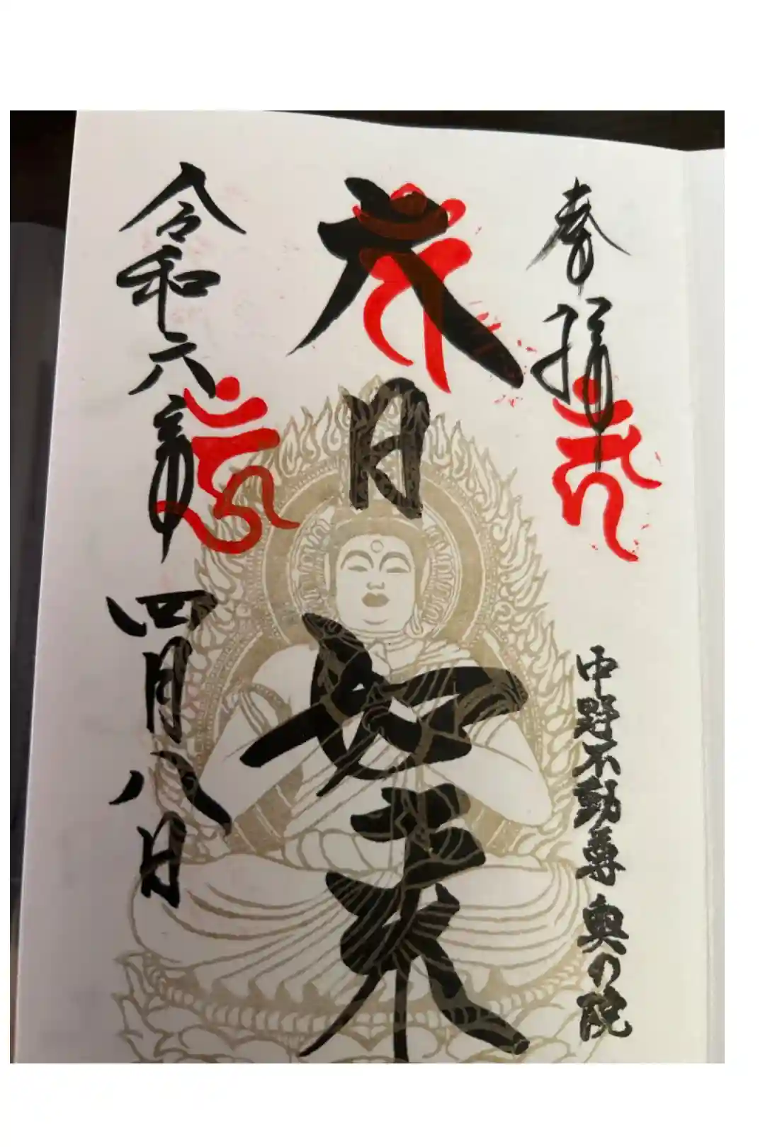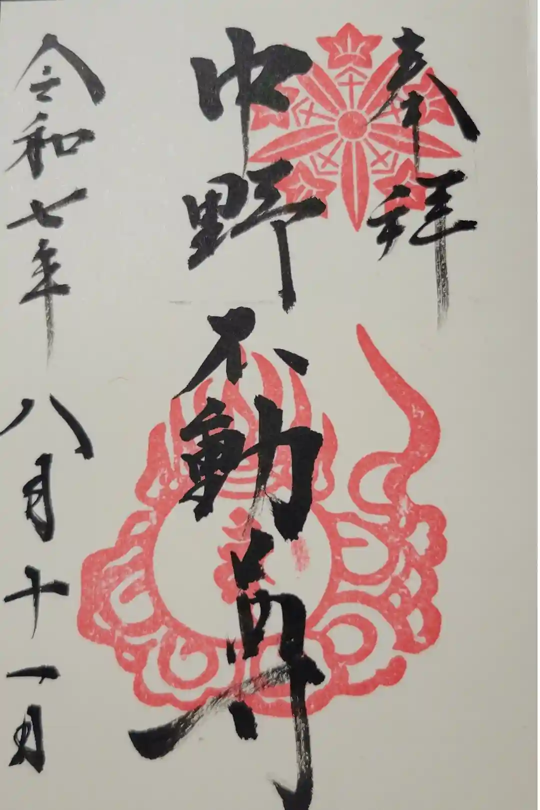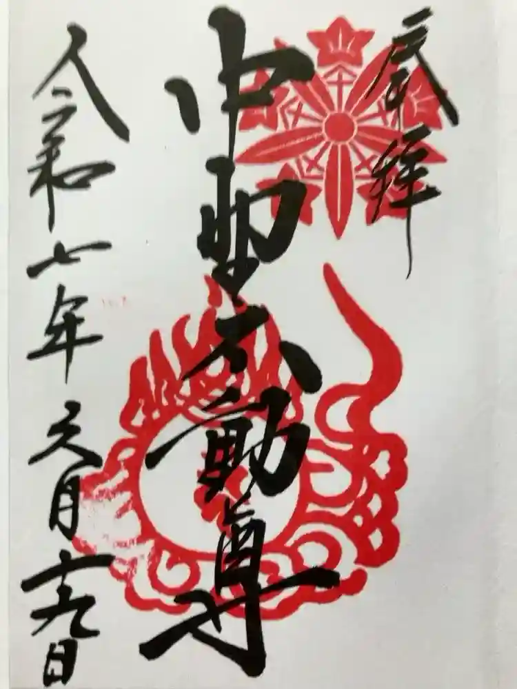 真ん中に中野不動尊と書かれ、右上に神紋の印、真ん中に梵字の印が押された御朱印です。