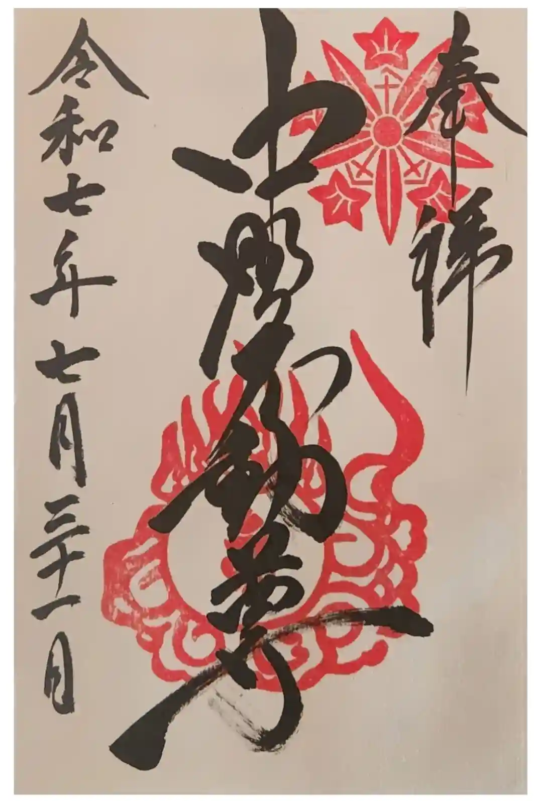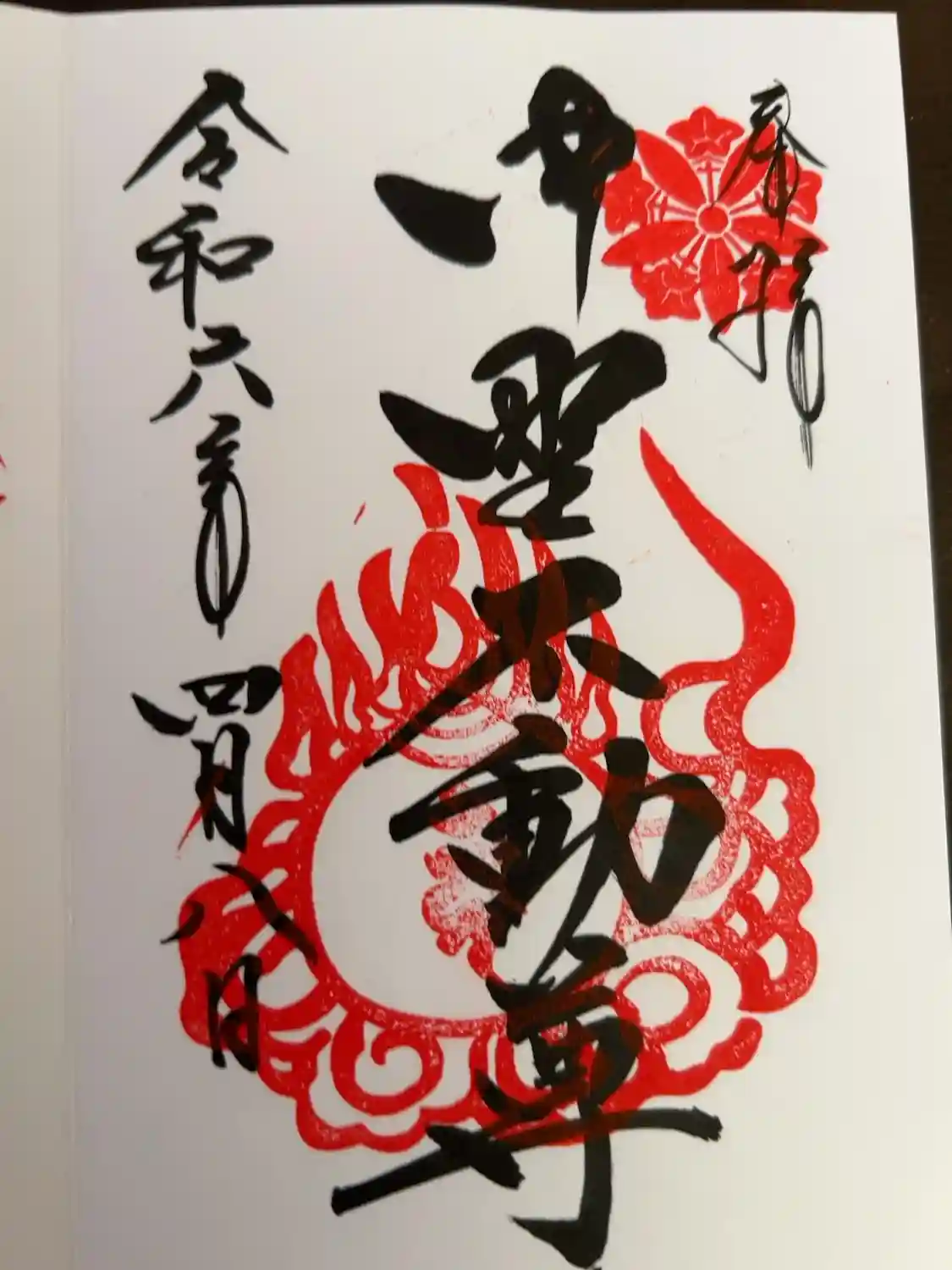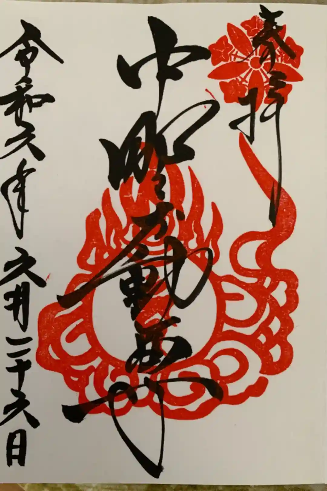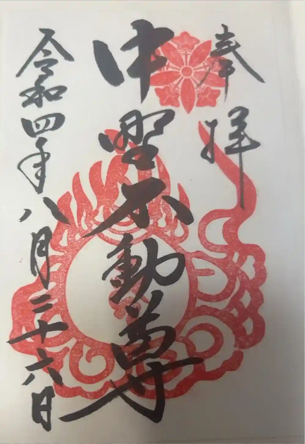 真ん中に中野不動尊と書かれ、右上に神紋の印、真ん中に梵字の印が押された御朱印です。