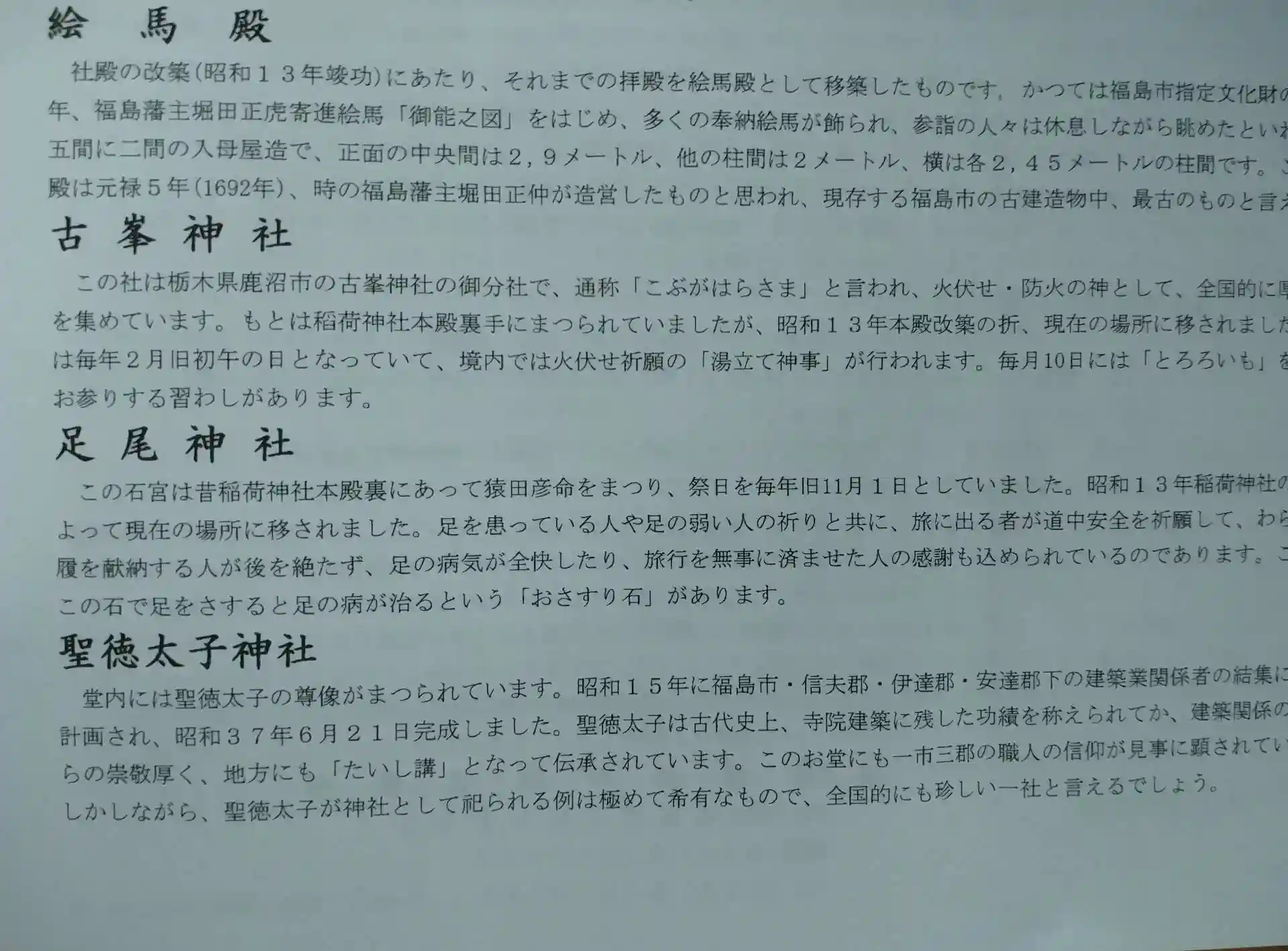 福島稲荷神社 しおりより(絵馬殿、古峯神社、足尾神社、聖徳太子神社)について書かれています