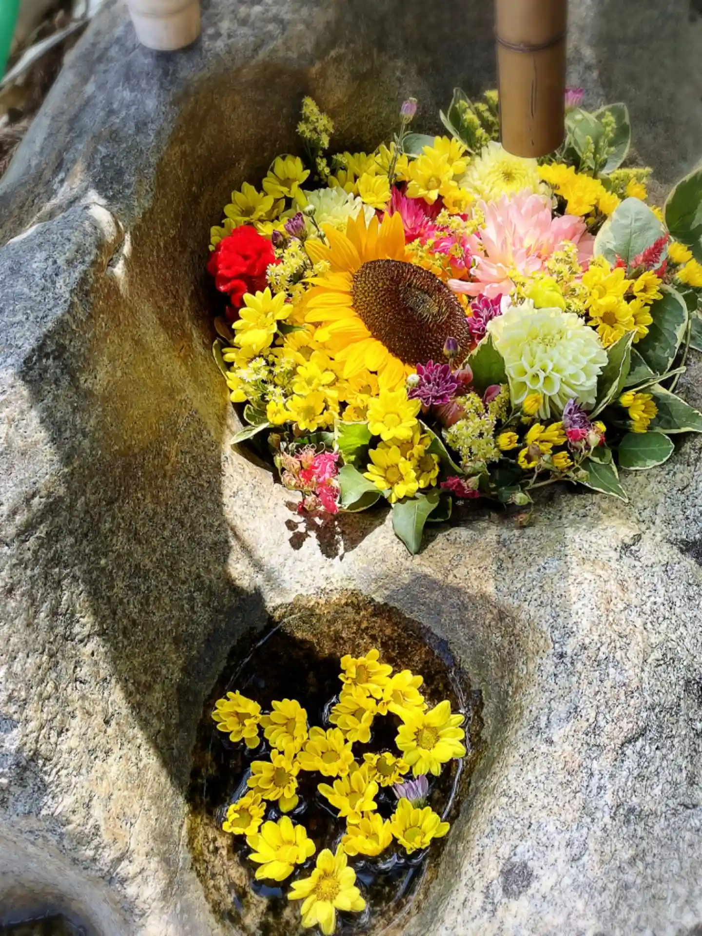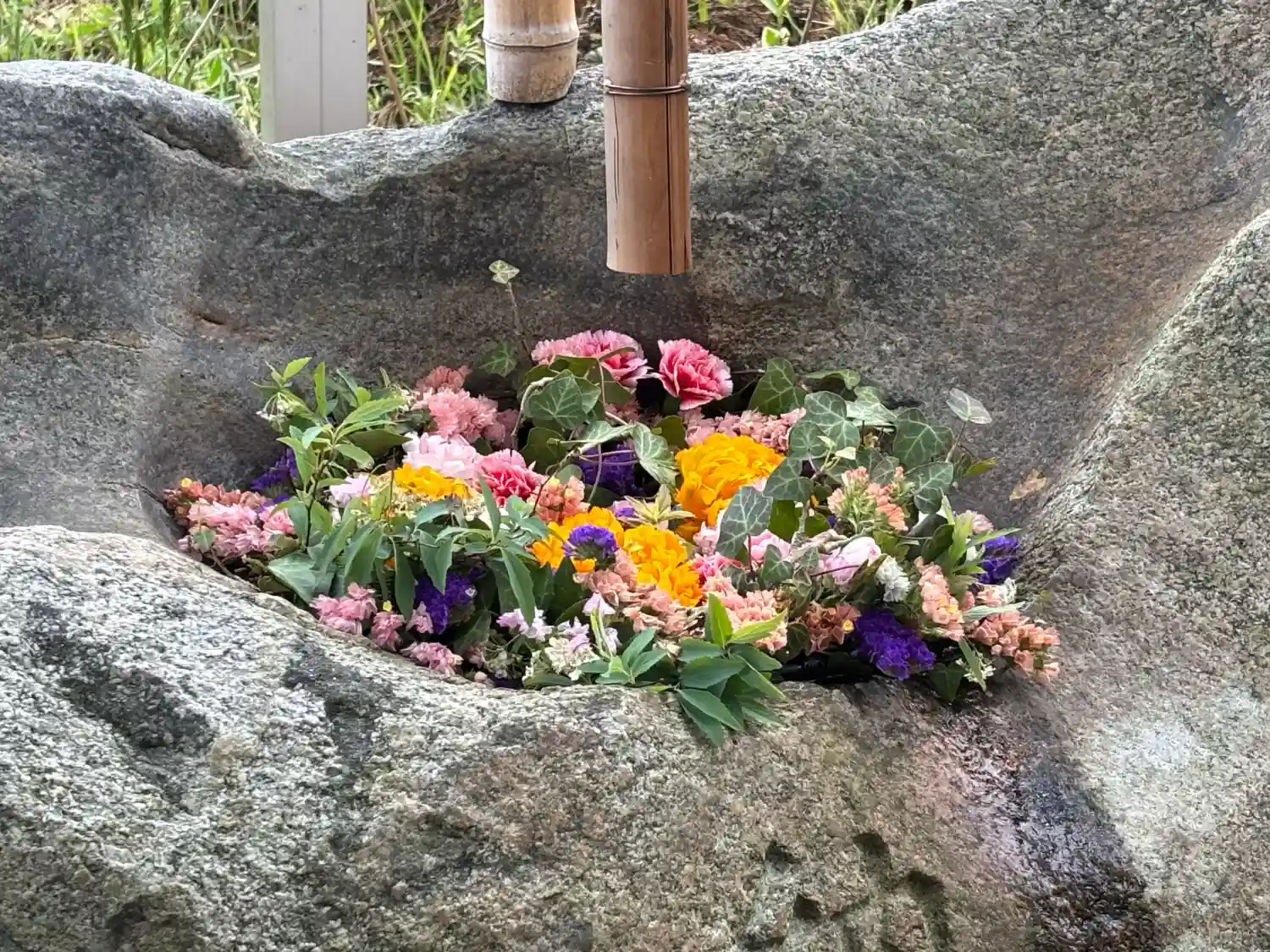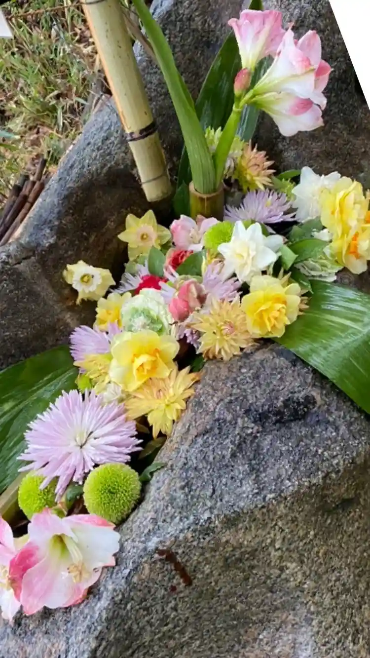 🌺花手水🌺階段をのぼりきった所の手水石 《市川秀香先生》に生けて頂きました。