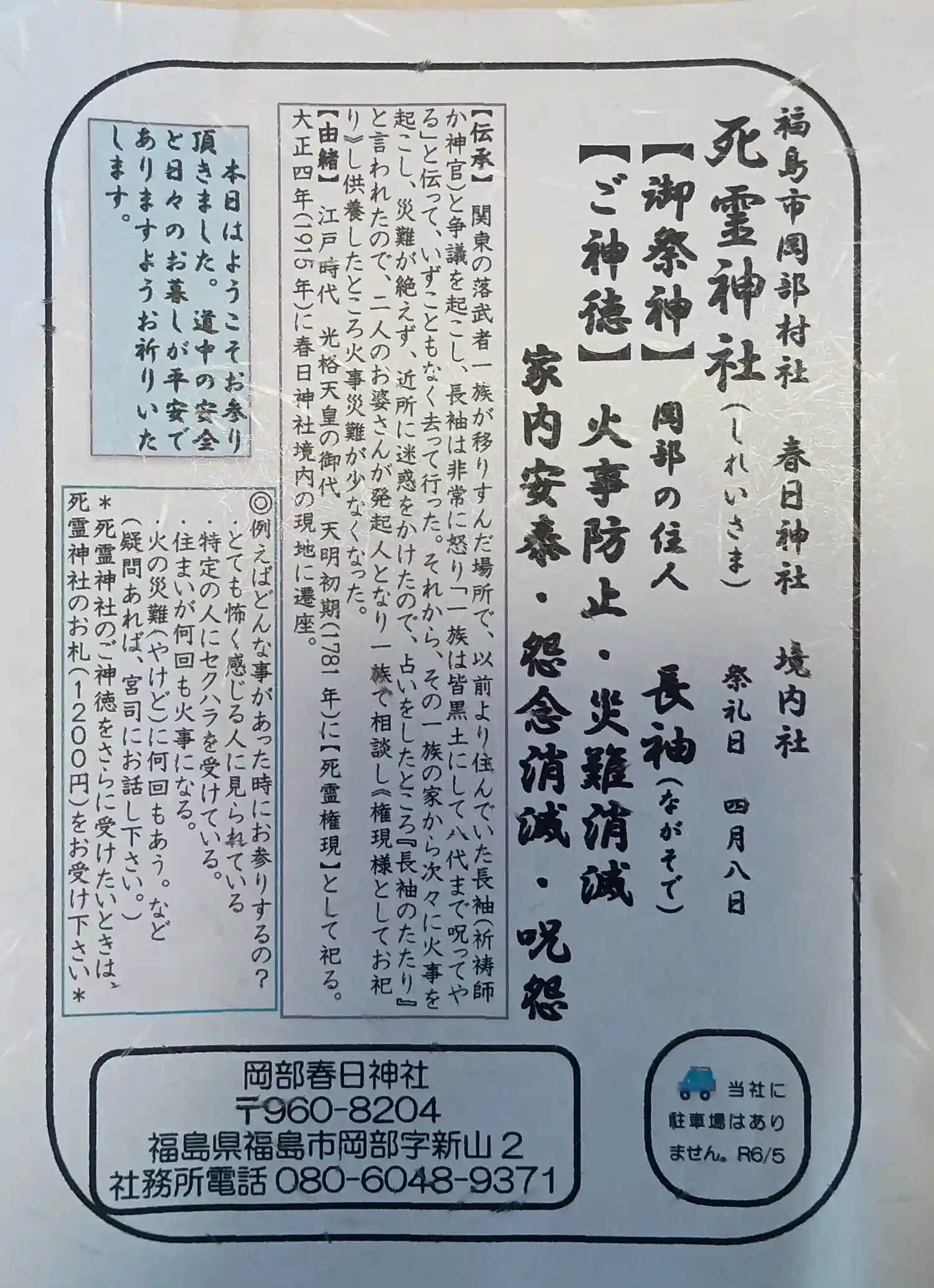 【略歴】 岡部春日神社へうつされる。 大正4年(1915) 『死霊神社』と改称し、石碑を新しくする。 昭和25年(1950)