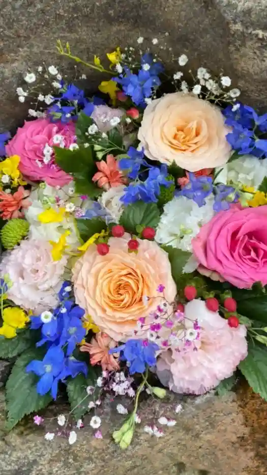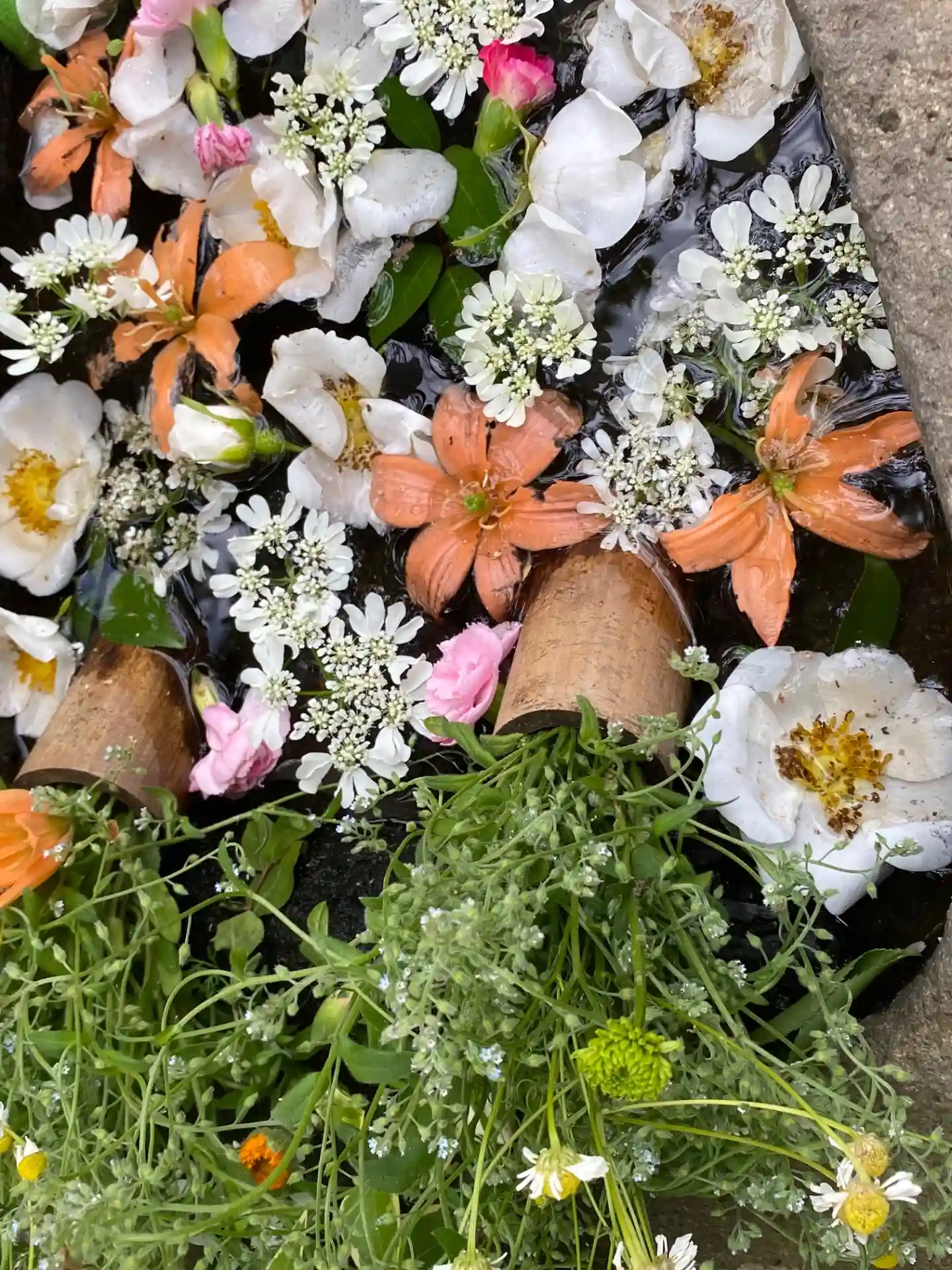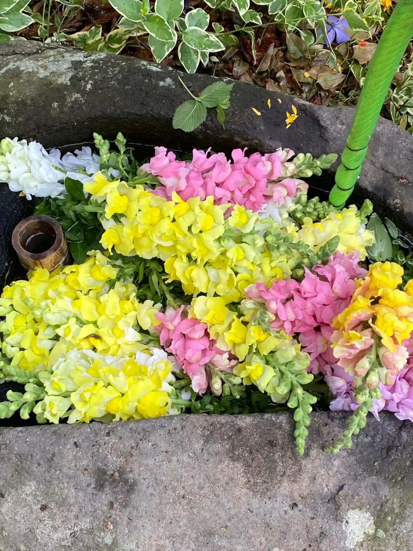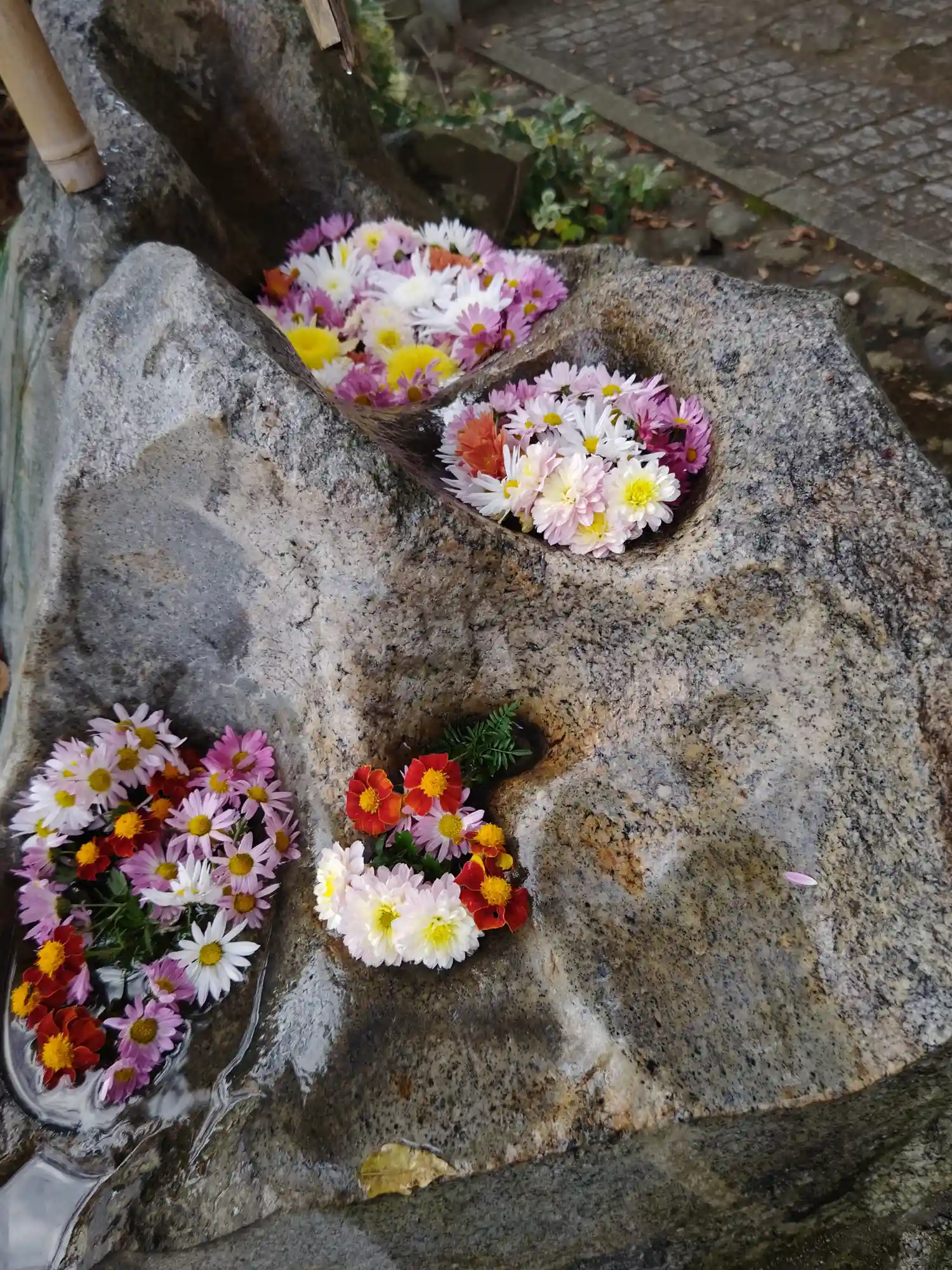 今年初めて生けて頂きました花手水です。