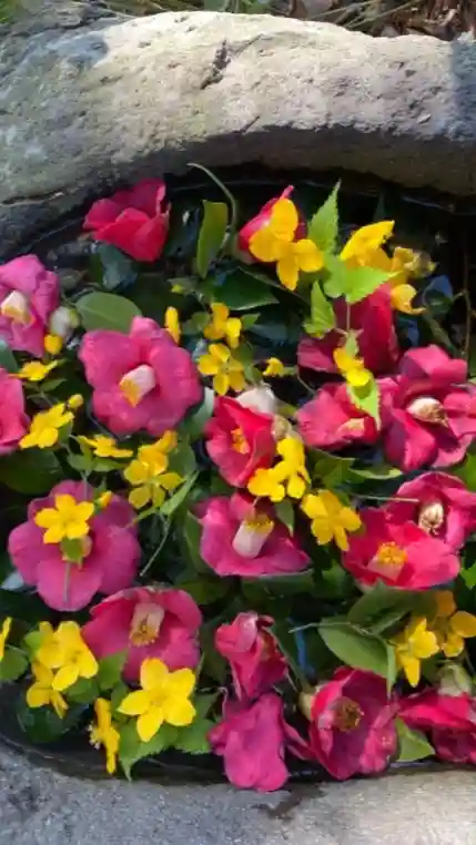🌺花手水🌺階段をのぼりきった所の手水石 境内の椿を中心に生けました。