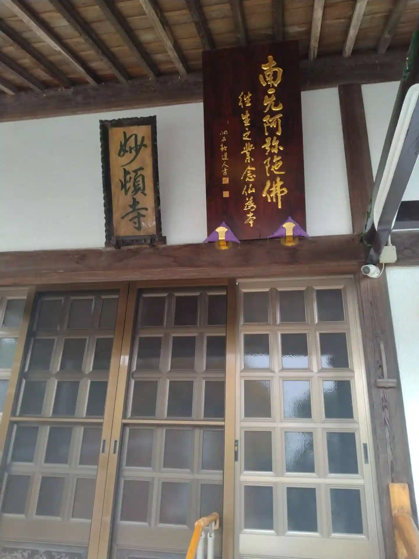 妙頓寺 本堂上部に掲げてある(南無阿弥陀佛、妙頓寺額)の様子です