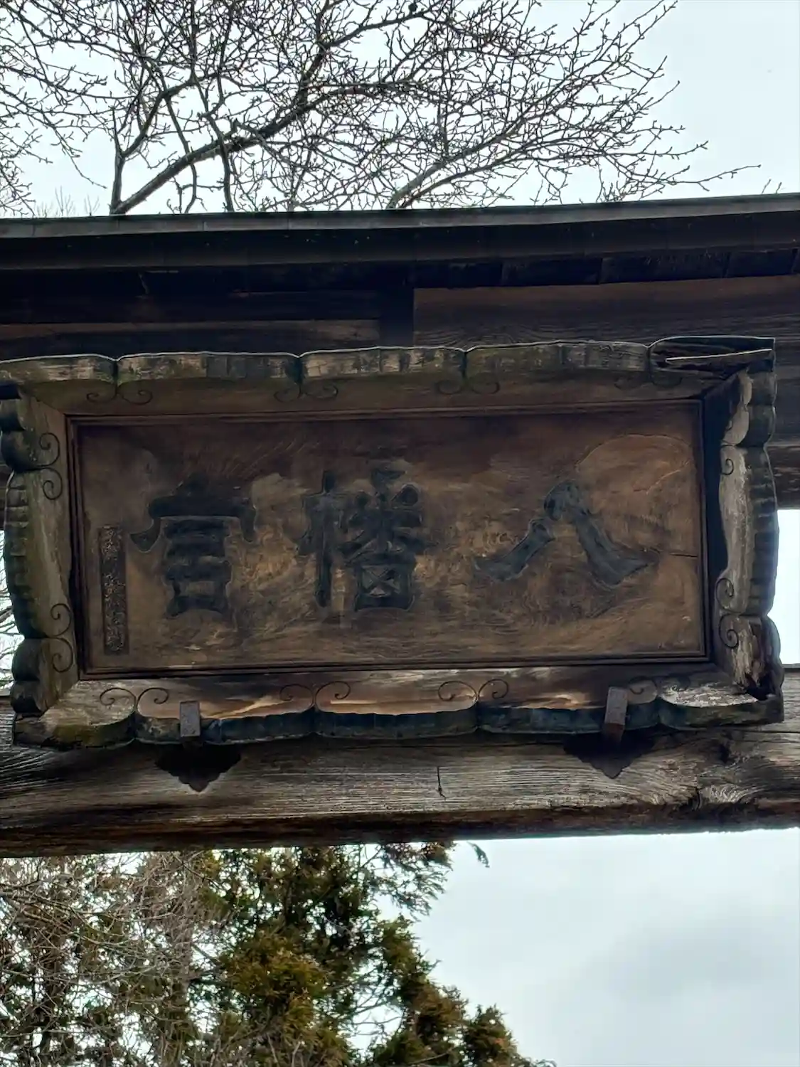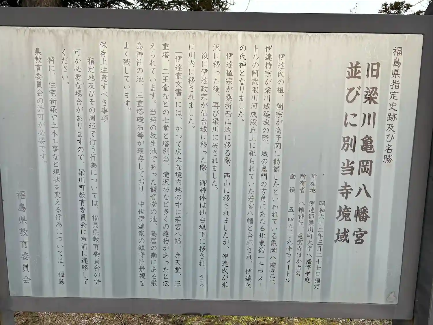 梁川八幡神社 参道を進むと左側にある(梁川町指定文化財第九号板)の様子です