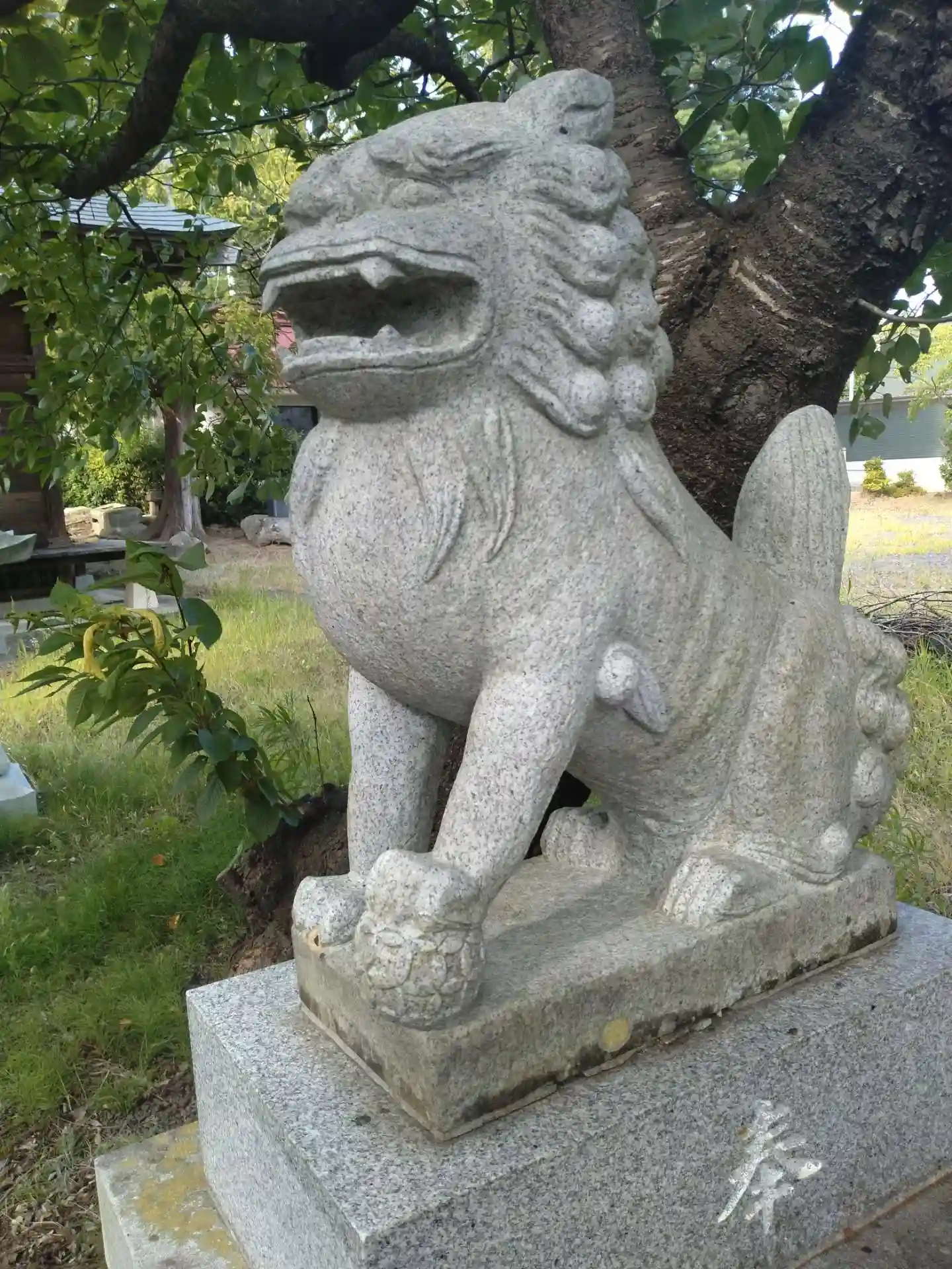 水雲神社 拝殿前に鎮座する(慰めようとしてる顔をしてる吽形の狛犬さん)です
