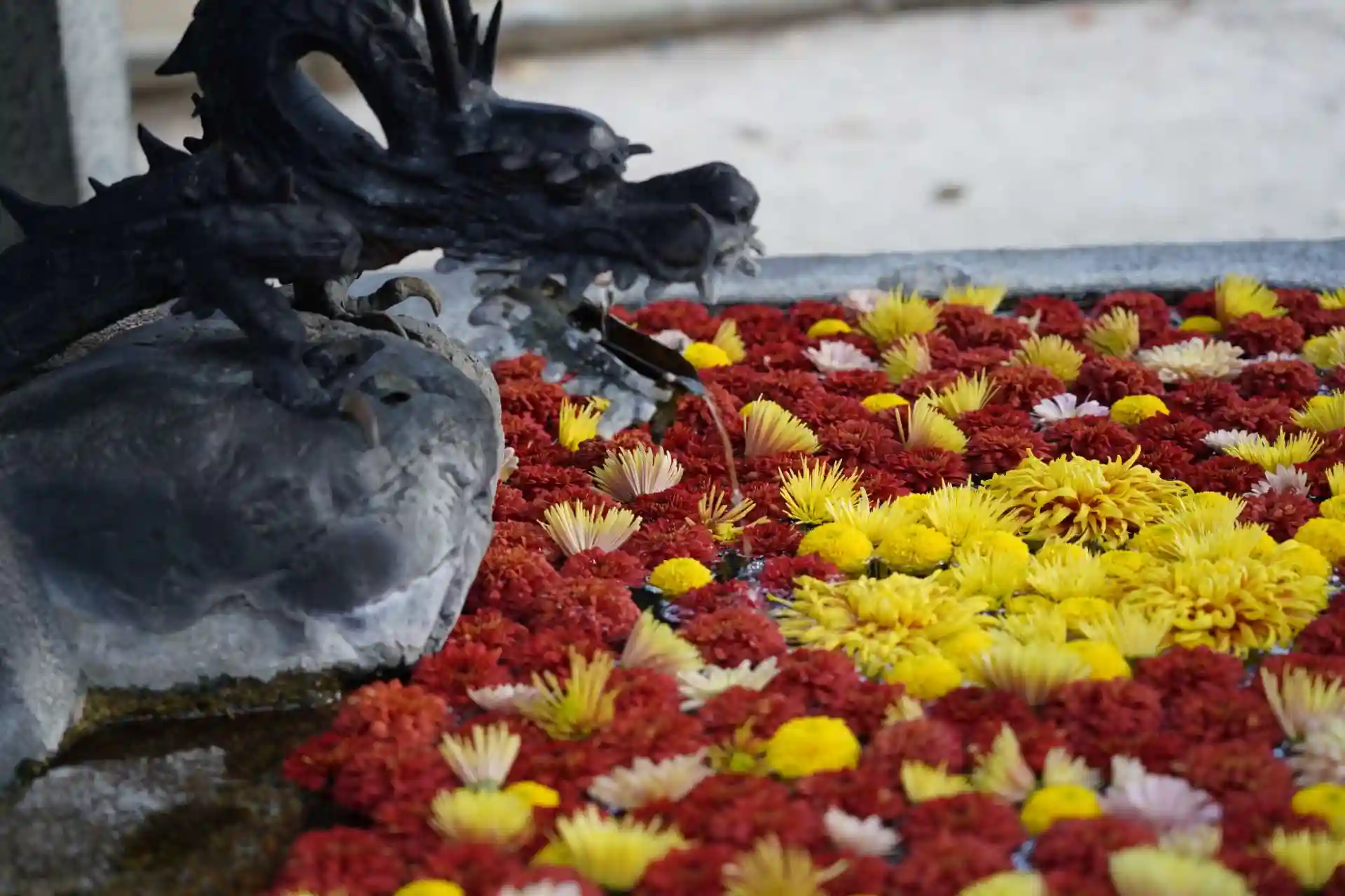 二本松神社でも、手水舎に赤や黄色の菊で一杯です。
