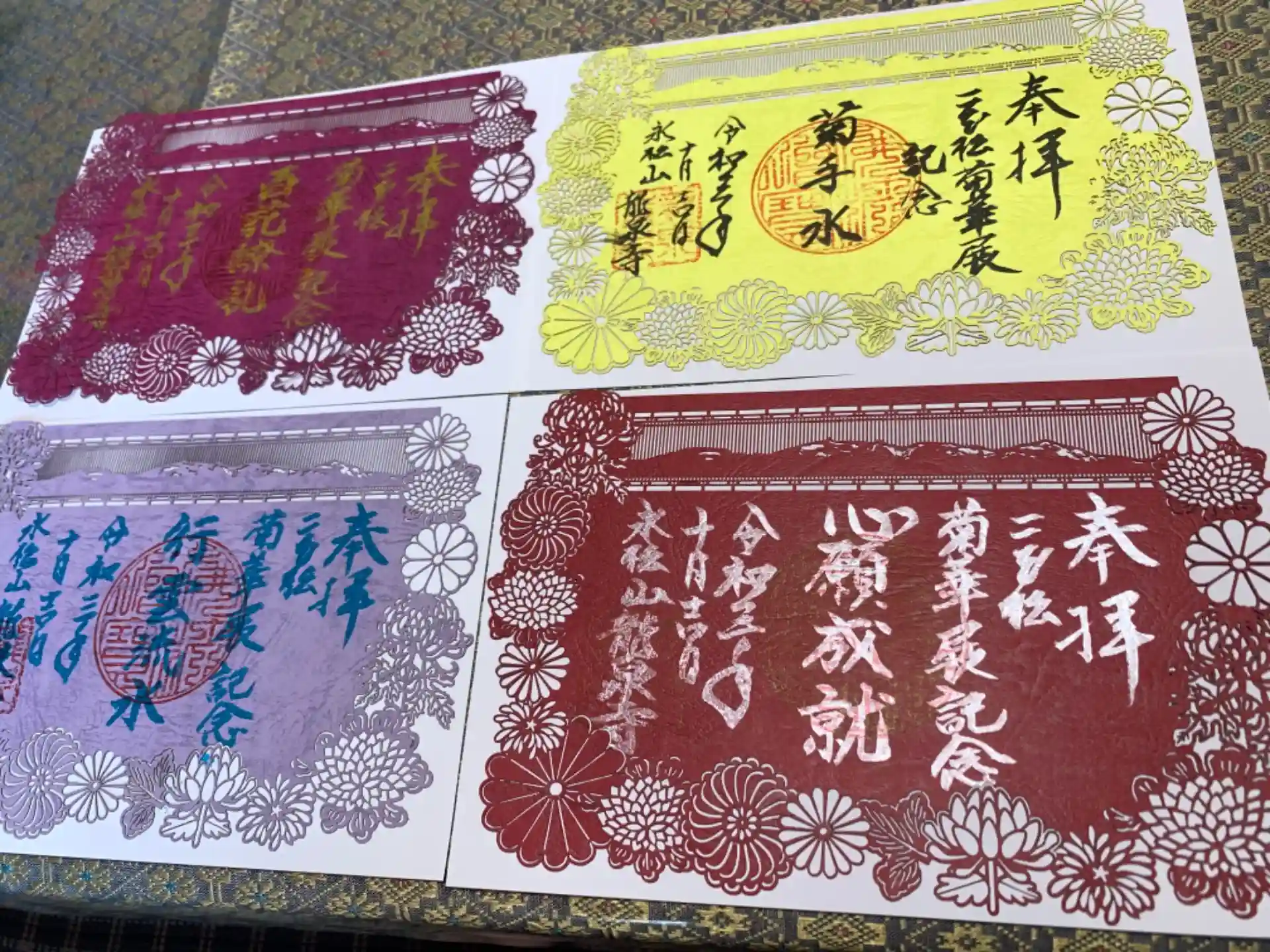 御朱印は菊手水をイメージし、欄間の部分には安達太良山を描いており、4色ご用意しております。