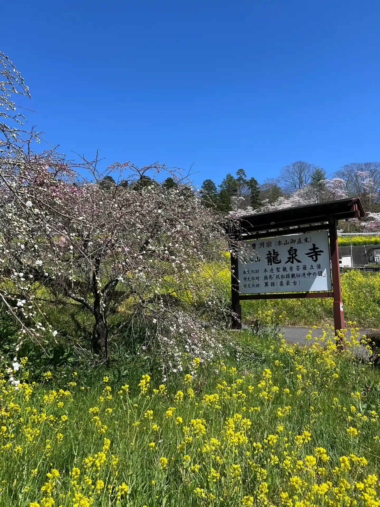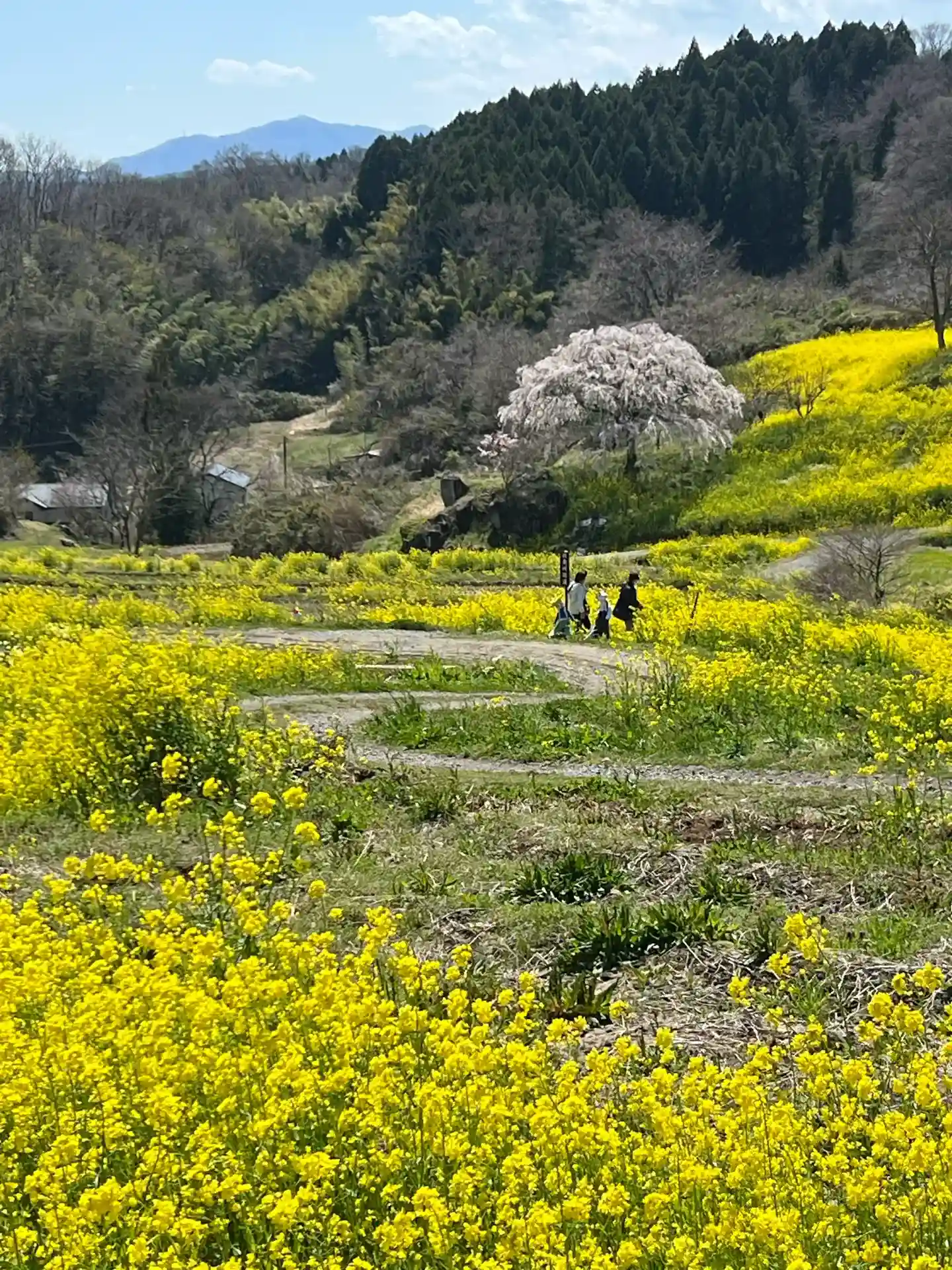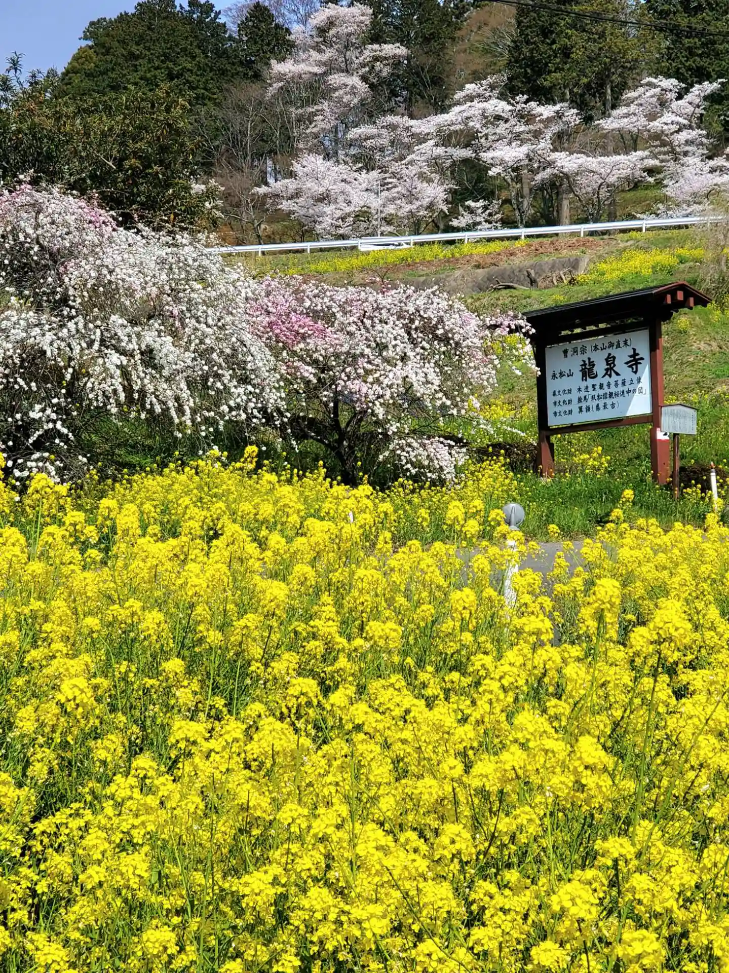 1週間ぶりの青空、龍泉寺前の段々畑は菜花が咲き乱れています。桜との共演も見ものです。