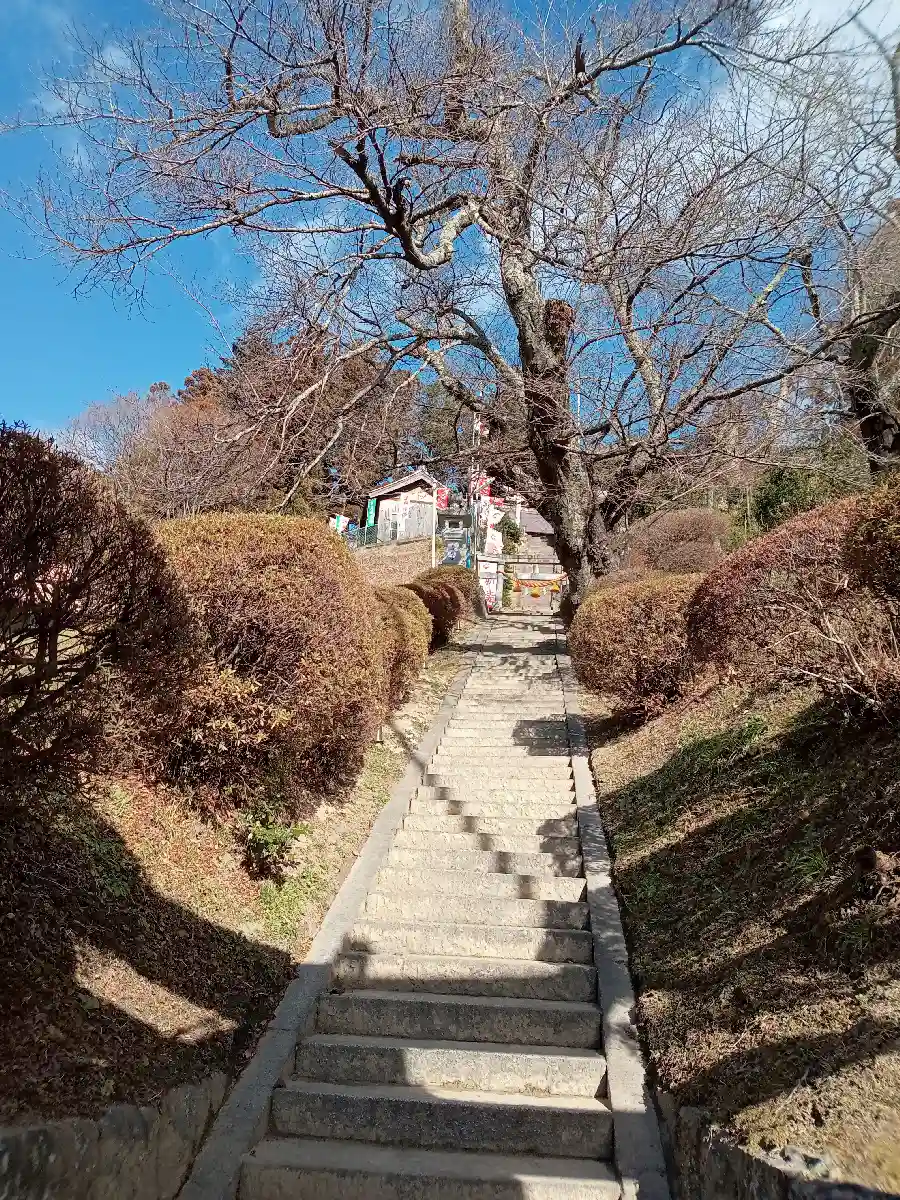 車は社殿裏手に続く参道からのぼっても数台停められそうですが、私は技術的に不安だったので、近くの住民センターに停めさせていただきました。センターから神社に続く階段もありました。