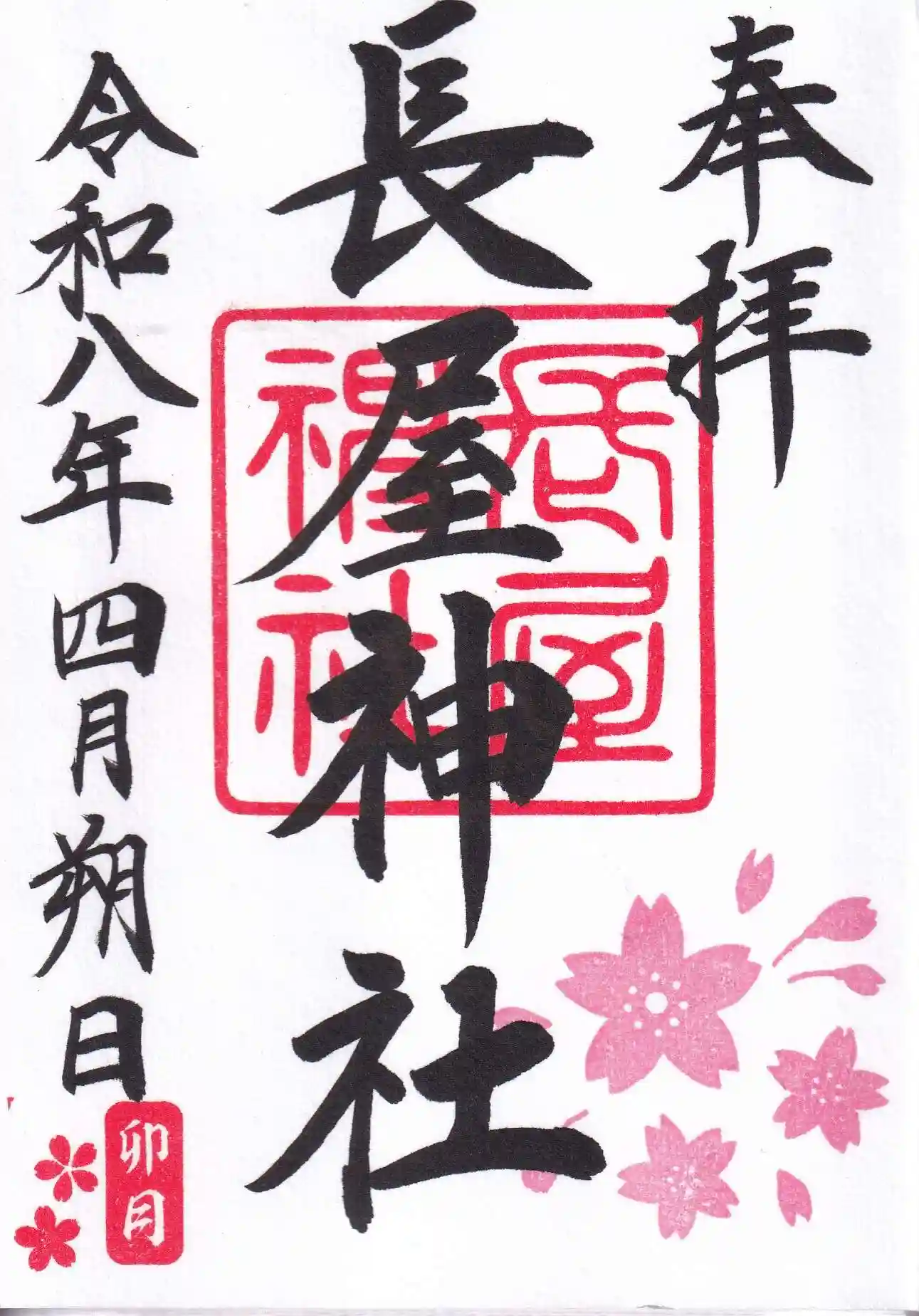 桜の花が添えられた卯月の御朱印です