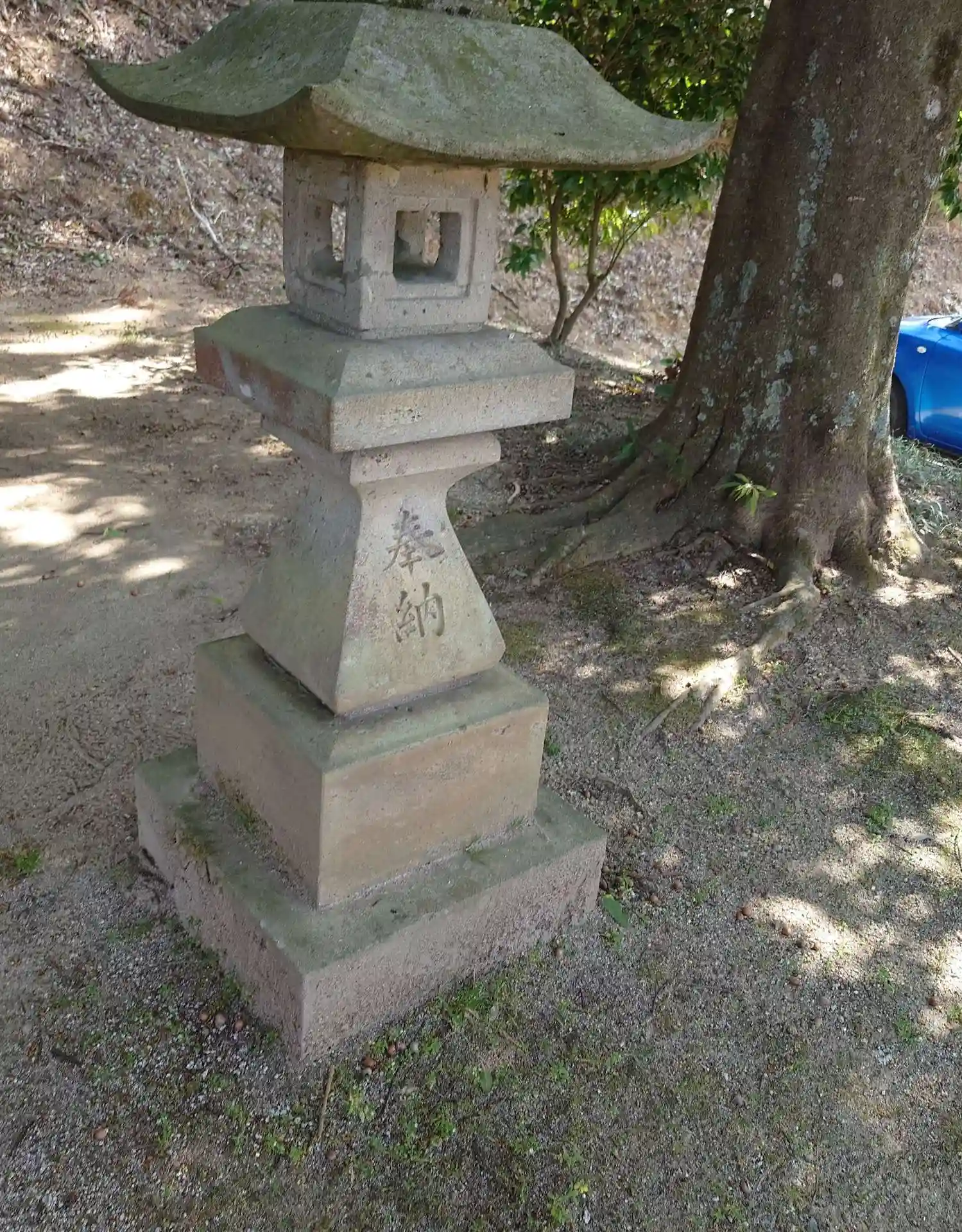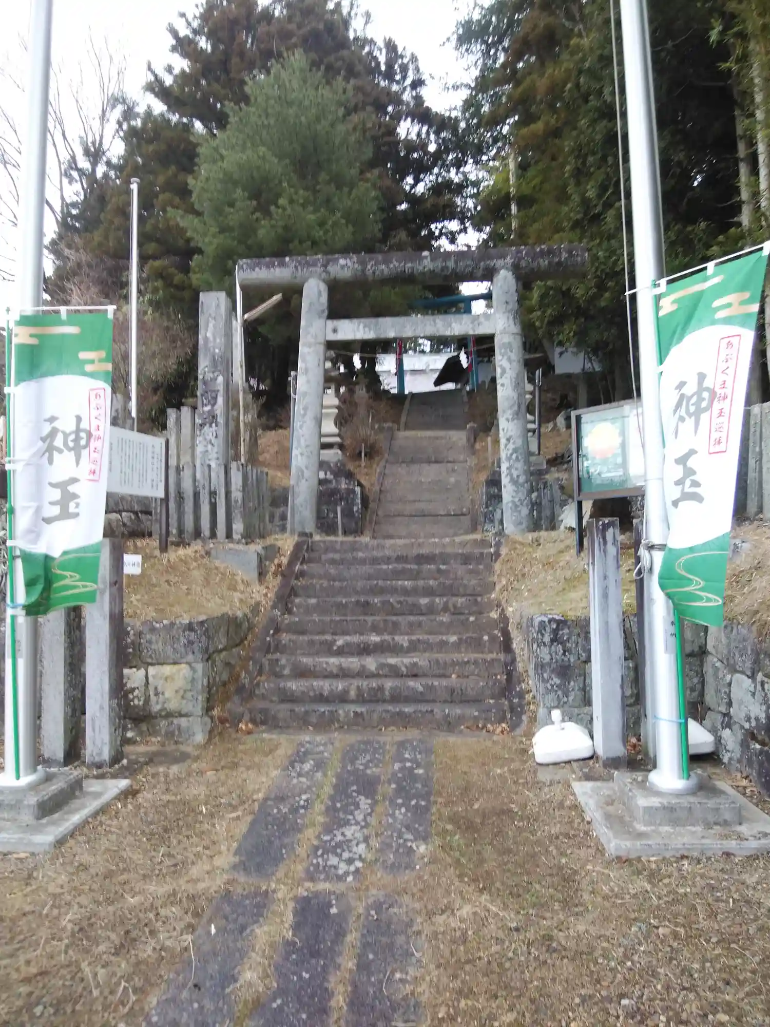 本宮市、最後の神社になりました。今迄の神社に比べると可愛い石段でした。遠目から見ると青い鳥居!?丁…