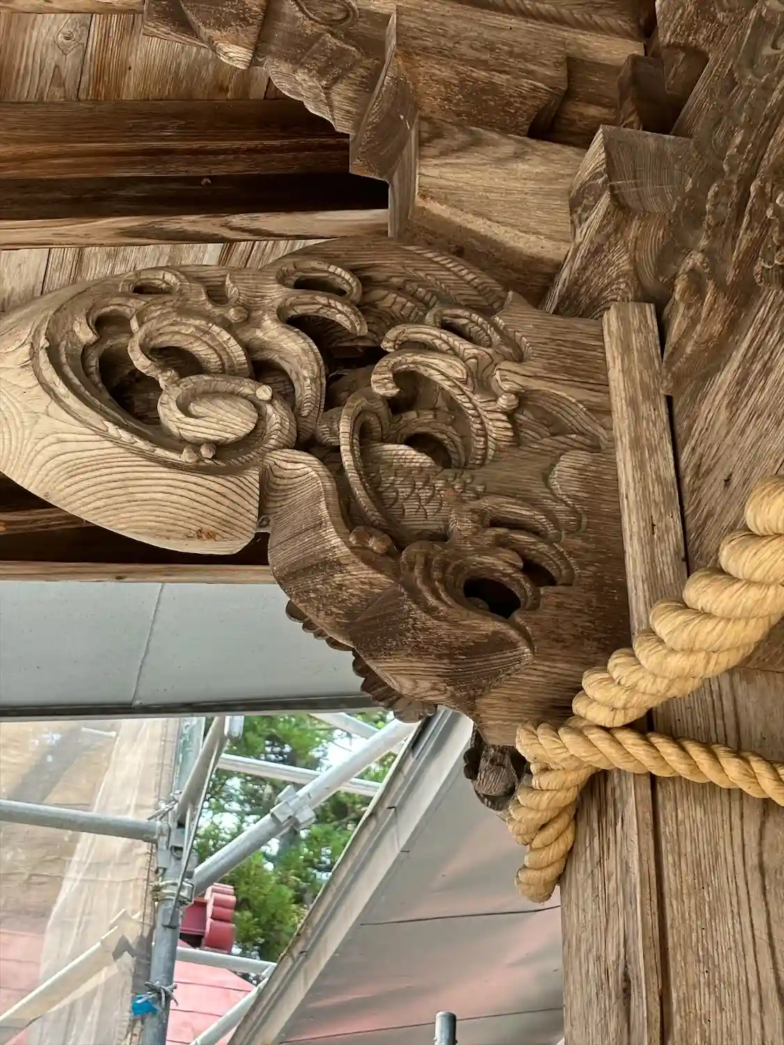 拝殿本殿共にお色直しの最中で、足場がしっかりかかっています。
