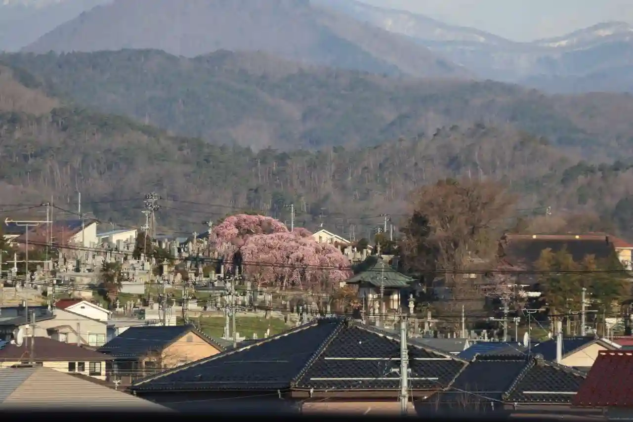 高台の墓地に咲く桜は遠くからも望めます