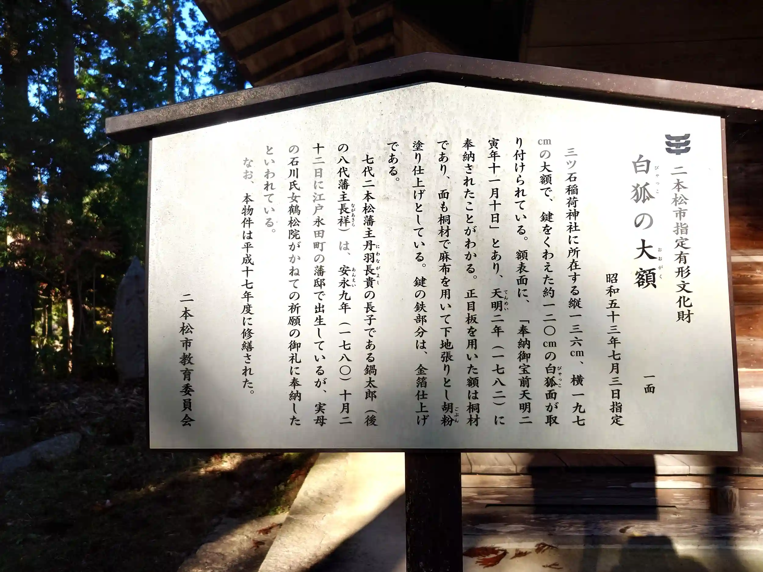 ・二本松城主丹羽公の氏神として祀られています。 幸運をもたらすとされている白狐面(大きさが4尺もあり、その口には5尺余りの幸福をもたらす鍵をくわえている)の大額は、九代目藩主長貴公が長子出生祈願願御礼として奉納されました。