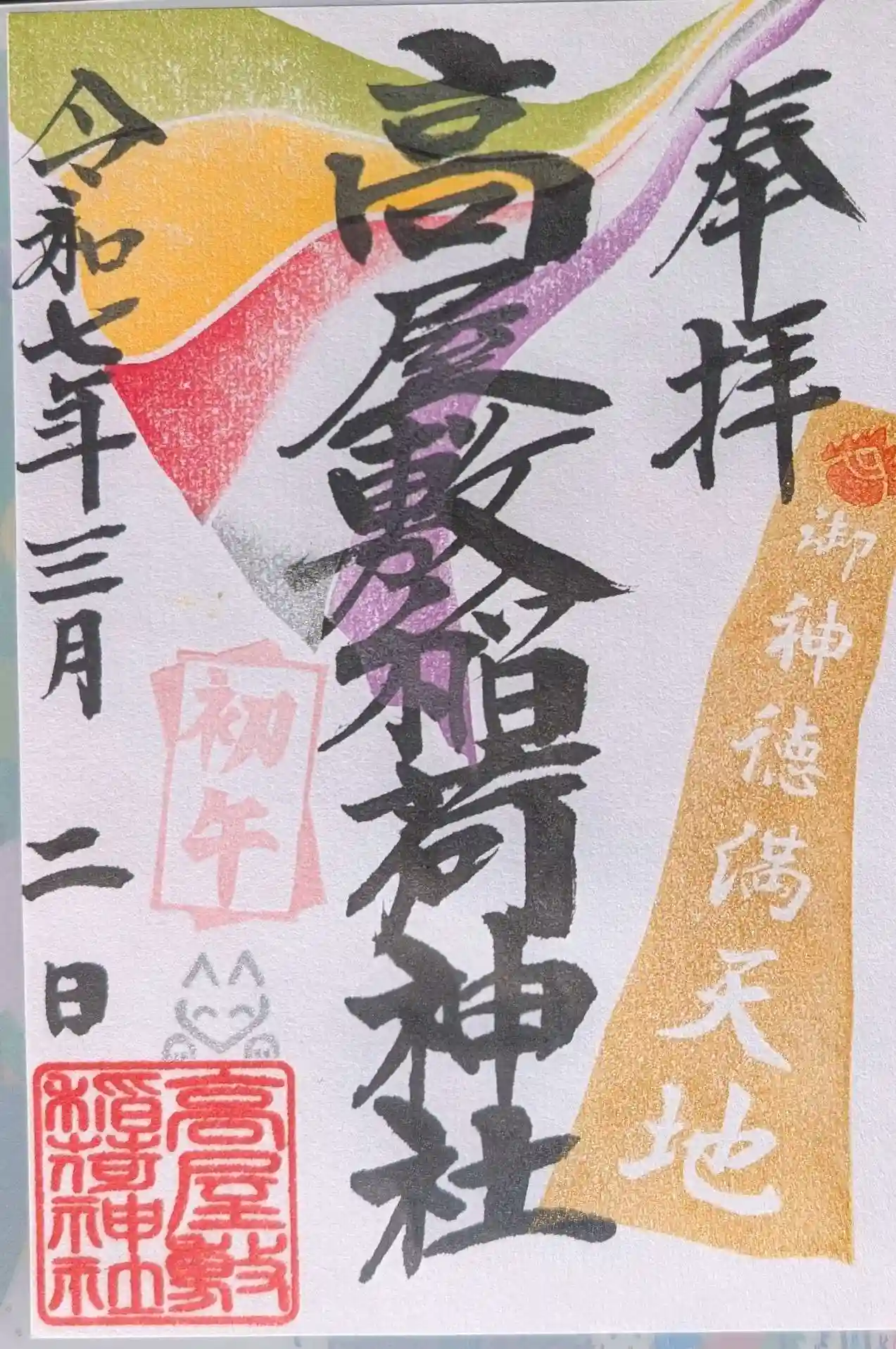 インスタグラムではカントリーパタタさん、ホトカミでも向日葵さんのお知らせを拝見して、本日の午後初午大祭へ。狐さん達にご挨拶。可愛いクリアファイルに限定御朱印と「おさがり」を拝受。宮司様より「初午大祭にお参りすると福を授かる」と言われているそうです。烏骨鶏さんに癒され、御神石に触れて参りました。