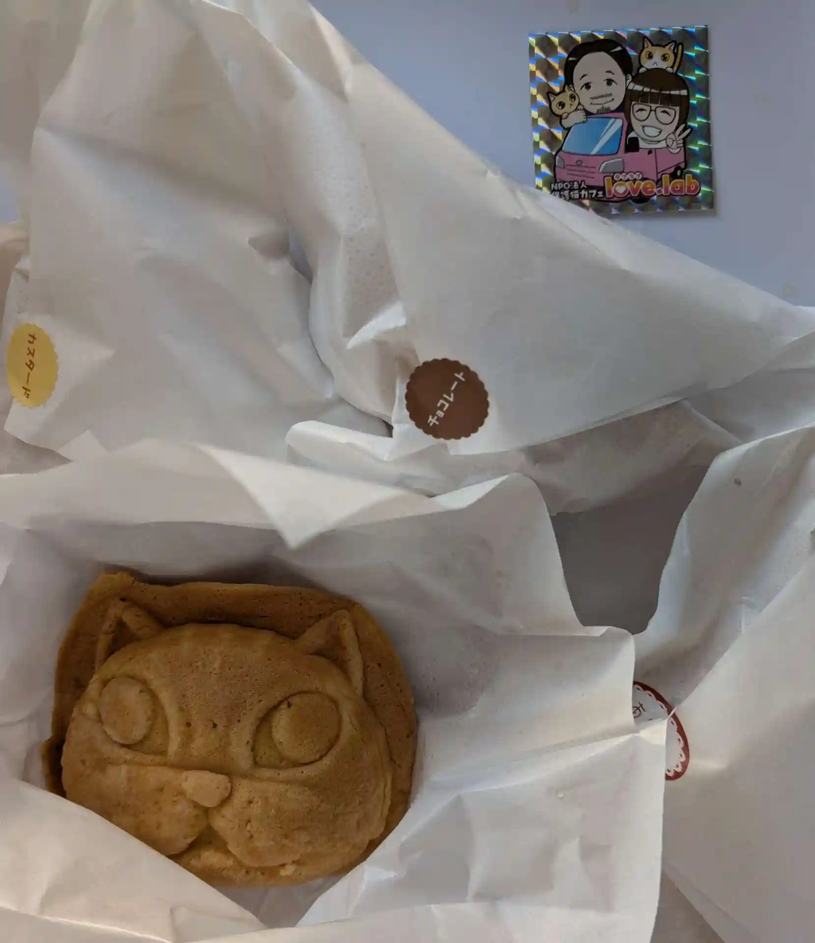 駐車場では保護猫カフェラブラブさんのキッチンカー名物の猫型大判焼き(あんこ、クリ―ム、チョコ)を購入。キラキラシ―ルがとても素敵で売っているのかしらと伺うと(おねだりしたようでm(_ _)m)…受け取りました❤