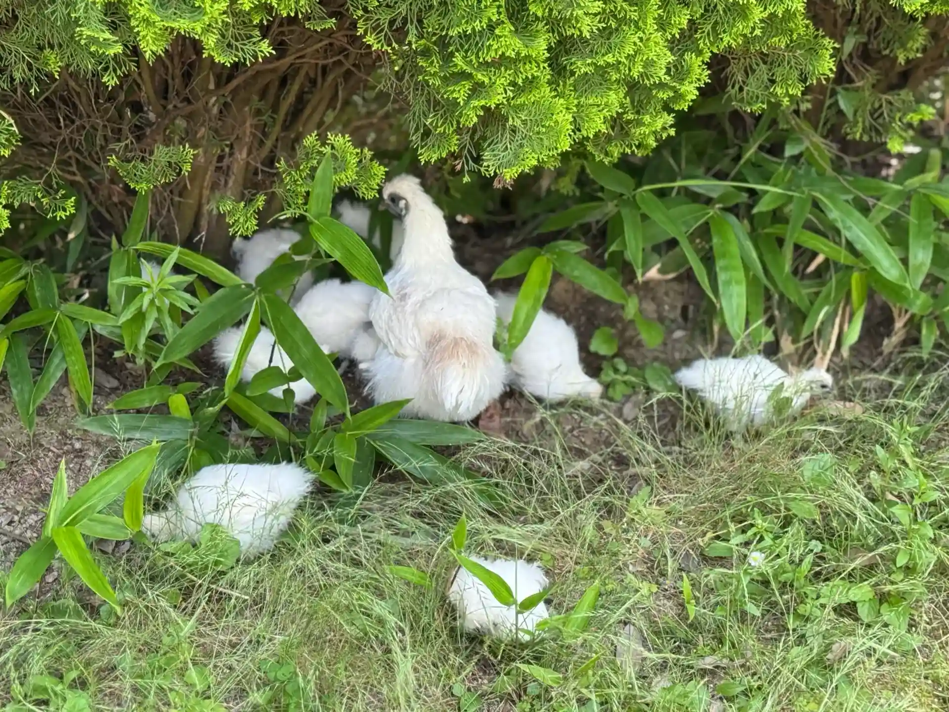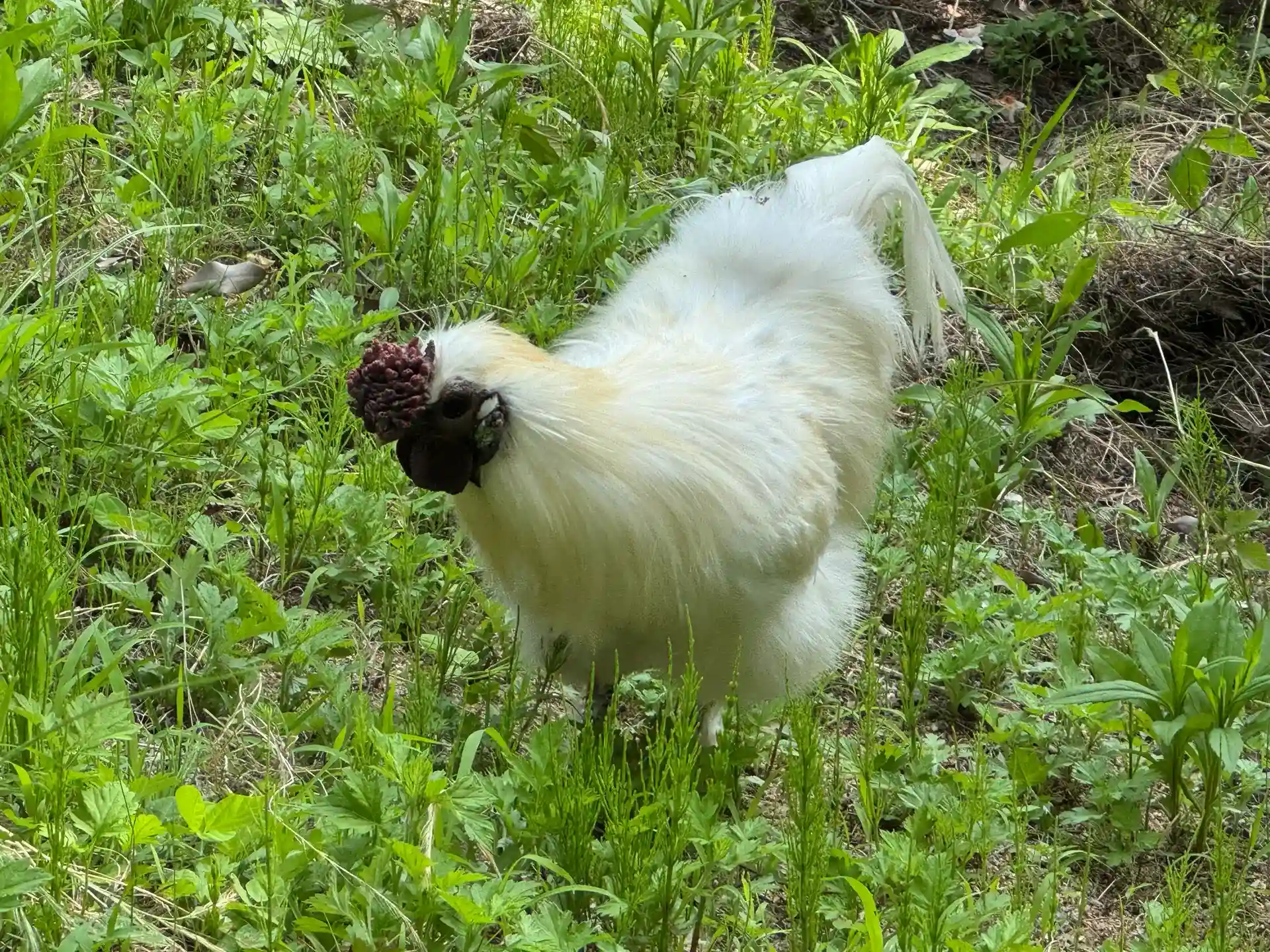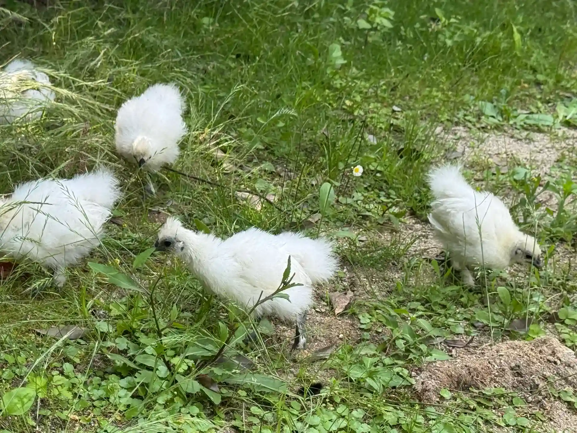 烏骨鶏さんたちは、ご飯を食べている中。旦那様も餌やりに。