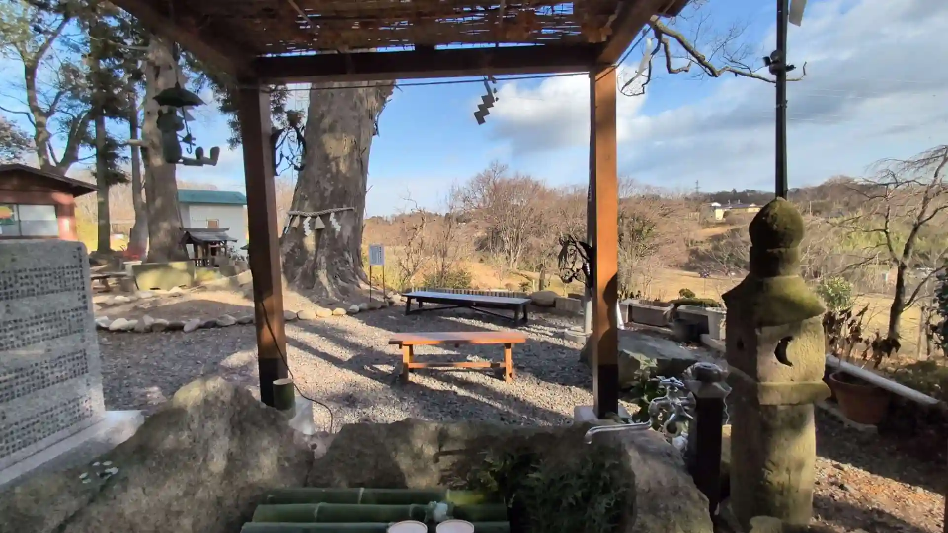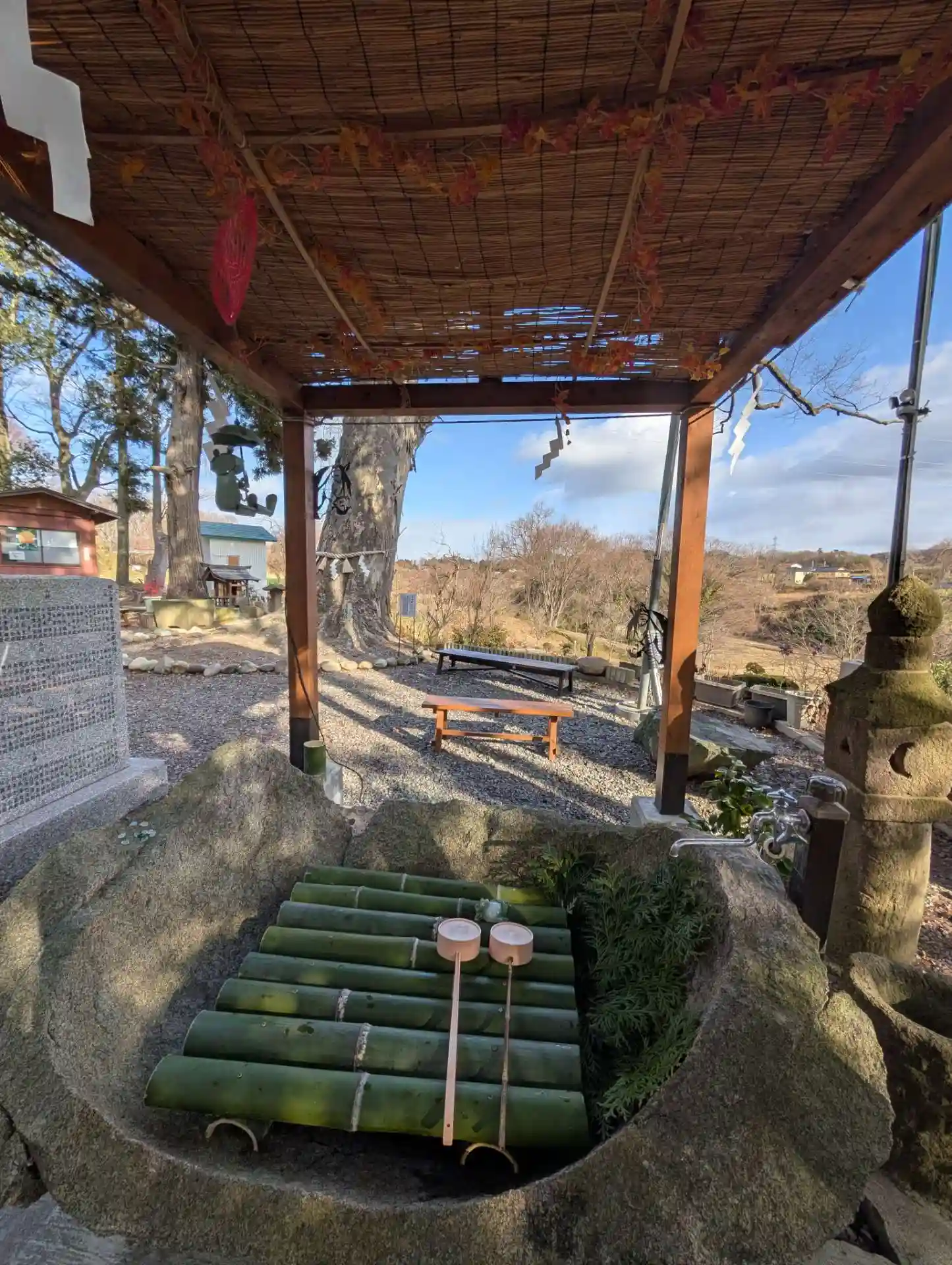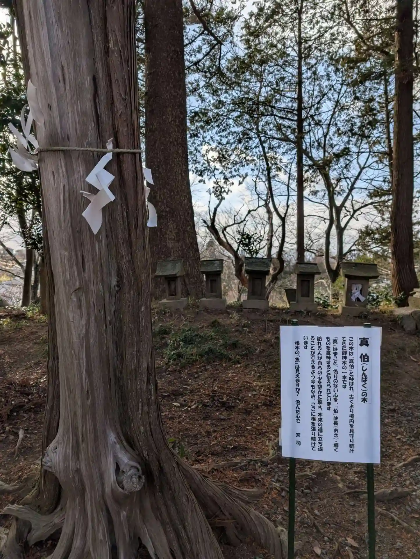 新年あけましておめでとうございます。午後1:30頃お参りしました。またまた雪がチラチラとしましたが、暫くして晴れました。階段をのぼり、新たに説明書きが追加されていて、蒲生氏郷公の休み石、連理(れんり)の木、真伯(しんぱく)の木を拝見。休み石はとても気になっていましたので、歴史を肌で感じることができました。