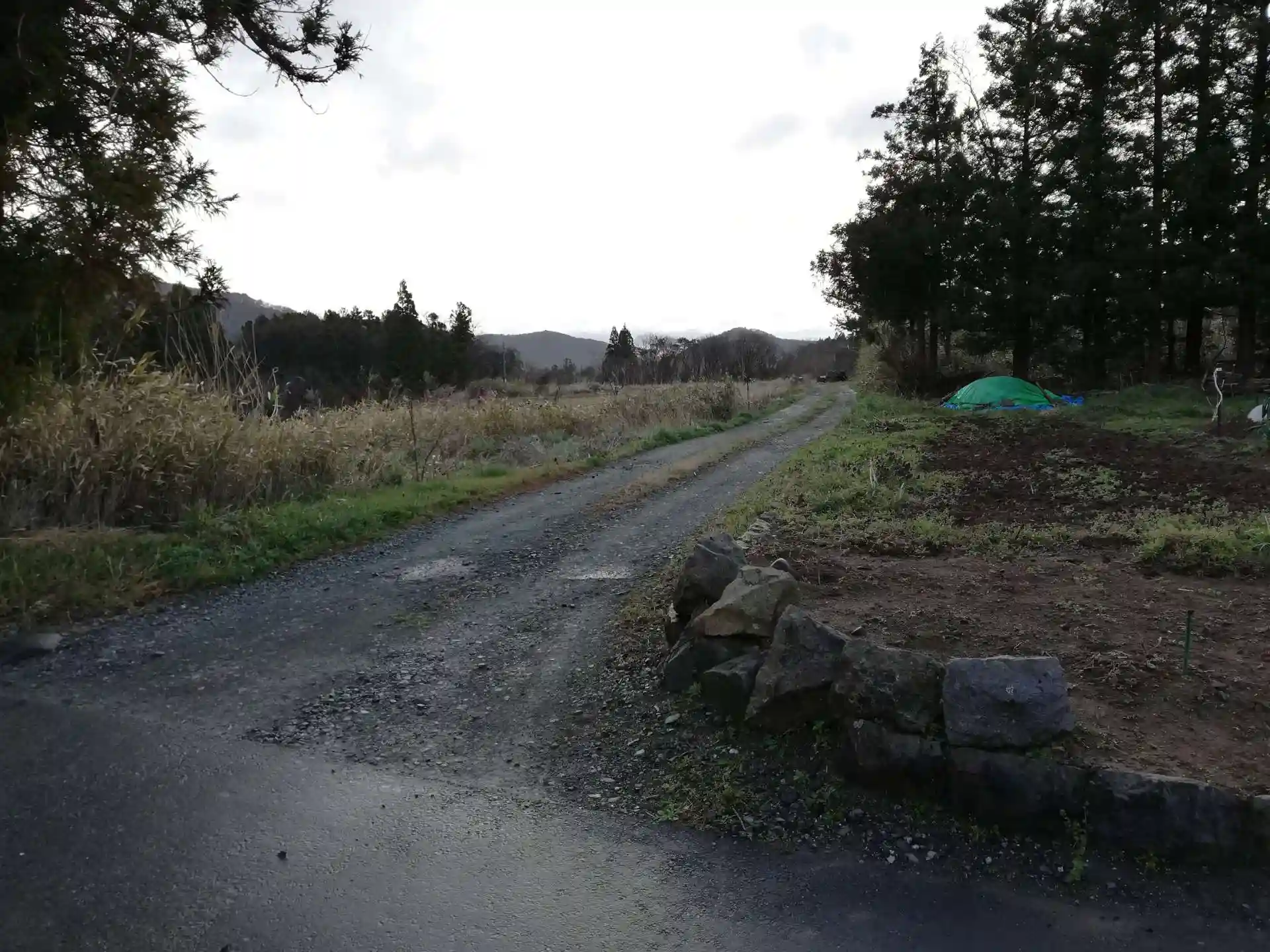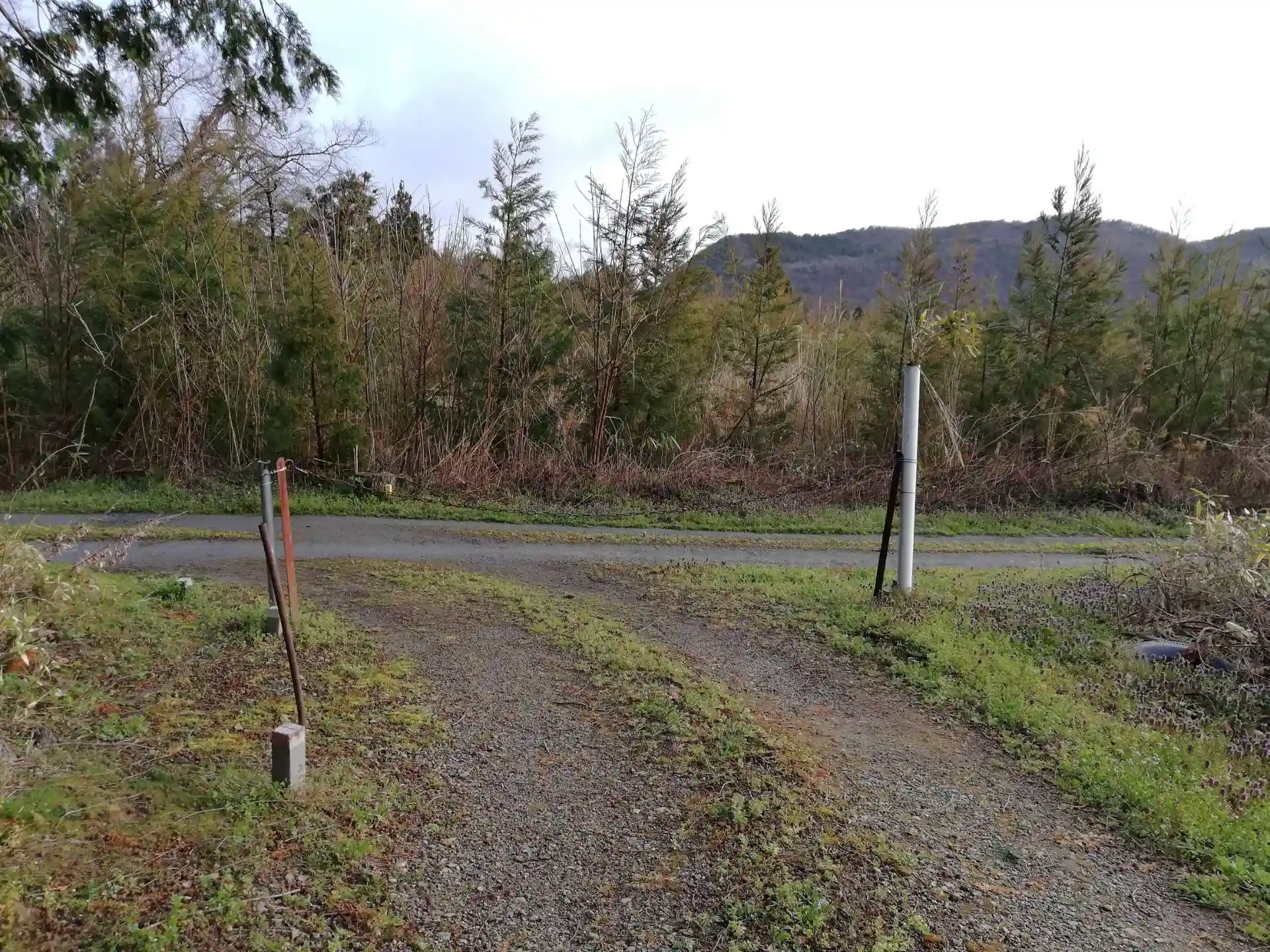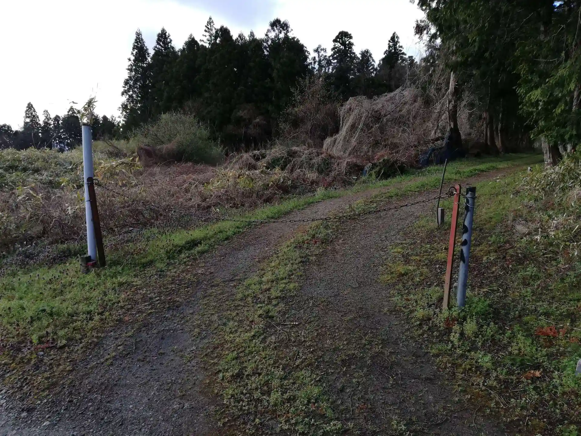 チェーンが張ってあるここが、裏参道の入口のようです。航空写真を見ると西方向へ行くと舗装された道路がありそうです。