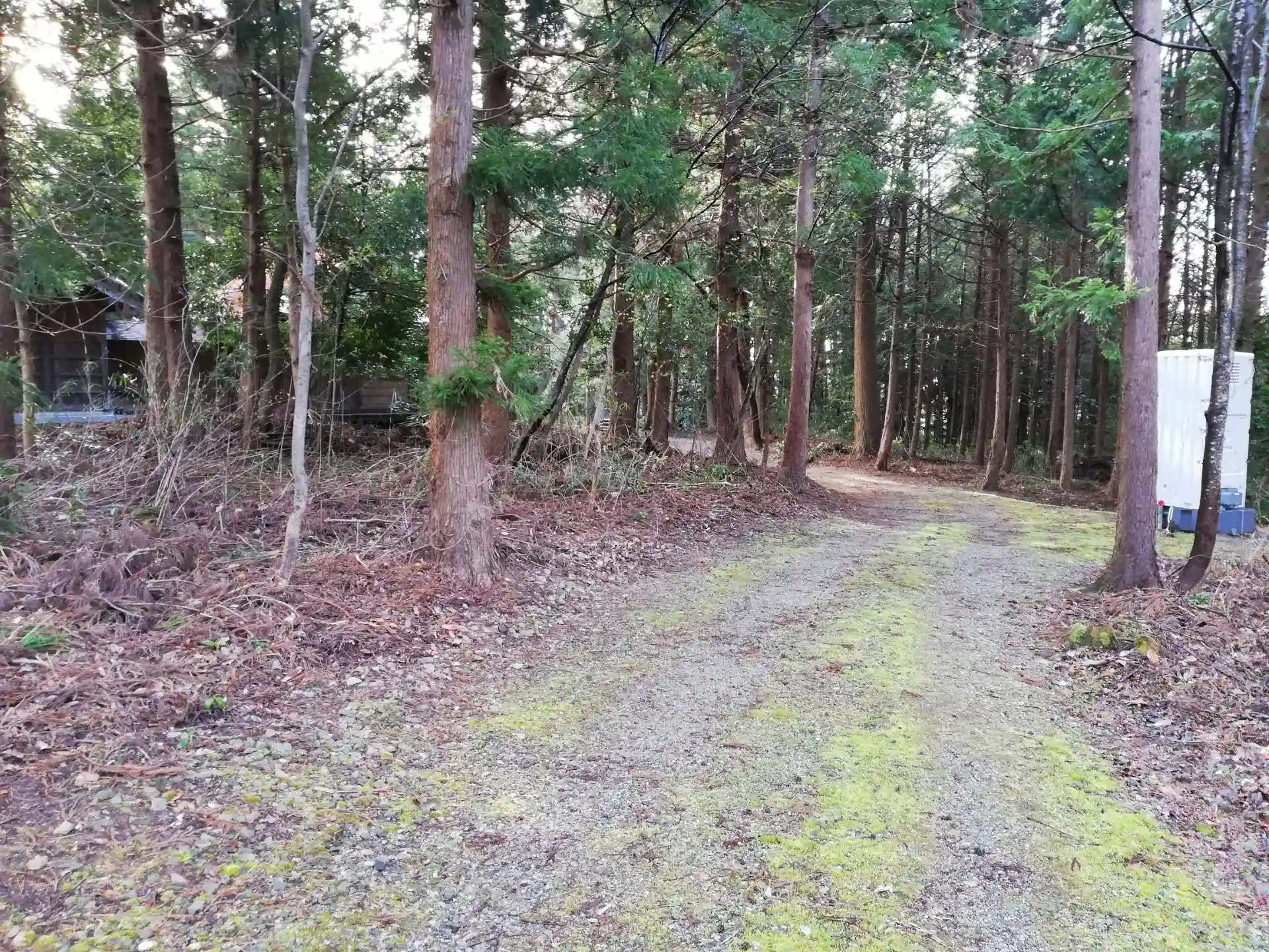 簡易トイレはどこから持ってきたのだろうと近づくと、わだちのある砂利道がありました。地図にはない道があれば歩いて確認したくなります。写真は歩き始めてから振り返ってお社とトイレを撮影しました。