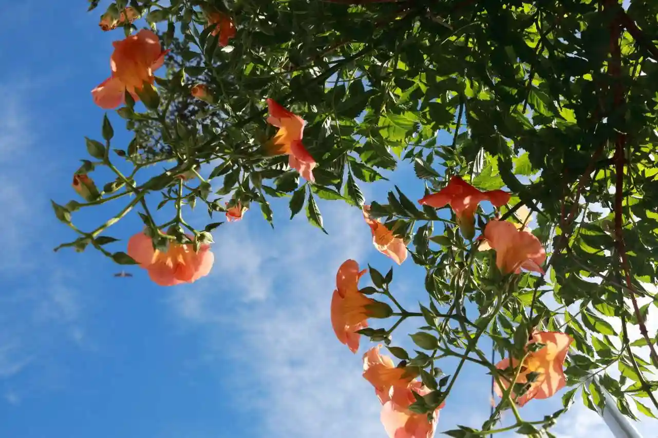 鳥居に寄り添うノウゼンカズラの花の季節