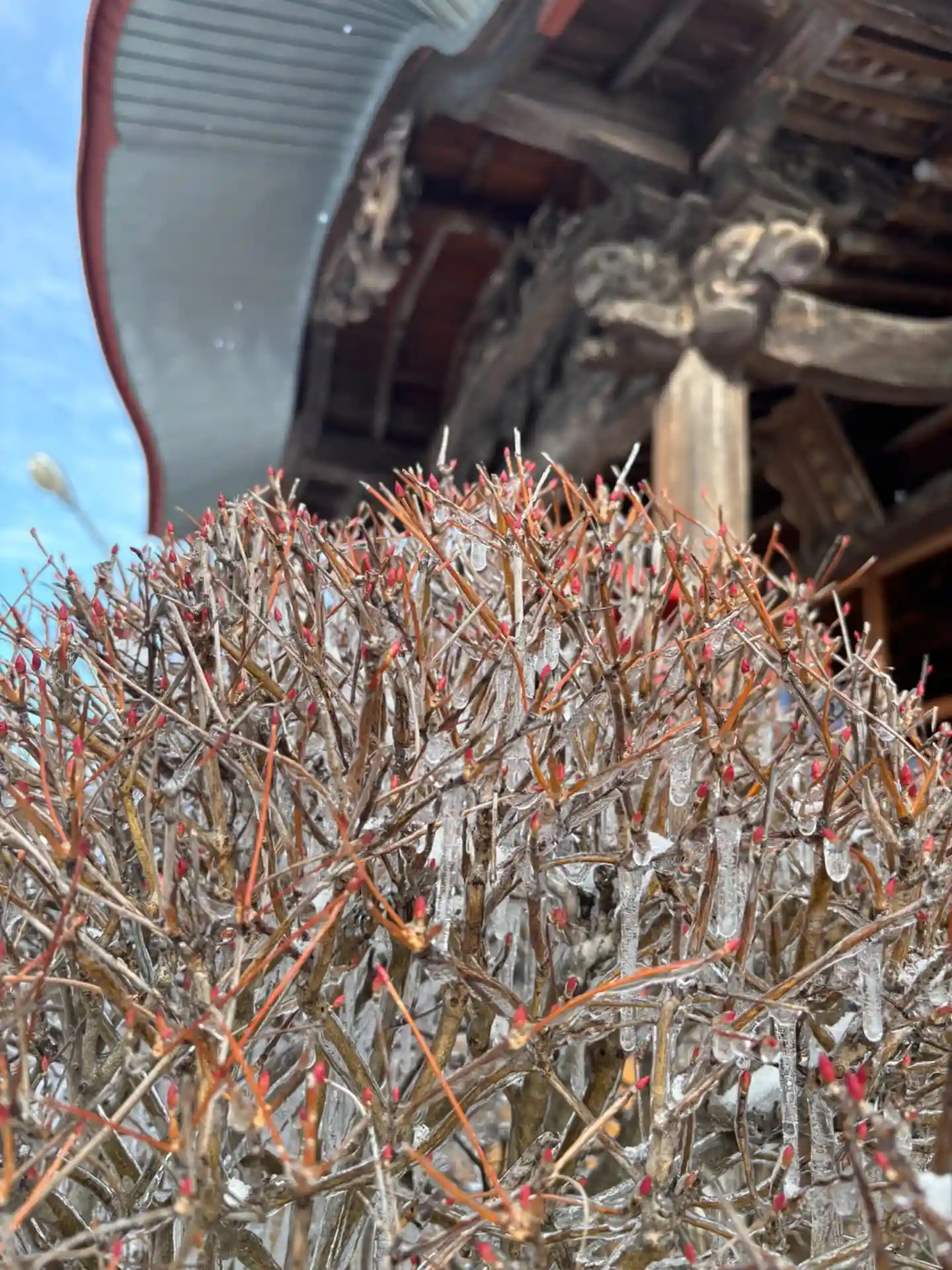 屋根からの雪解け水によってしぶき氷みたいに