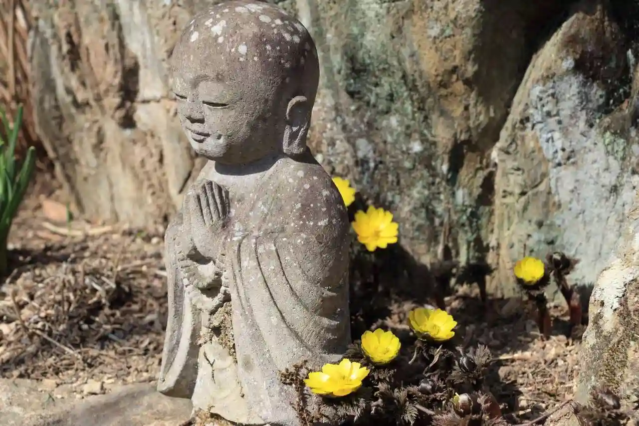 お花がお寺の庭に咲き始めています