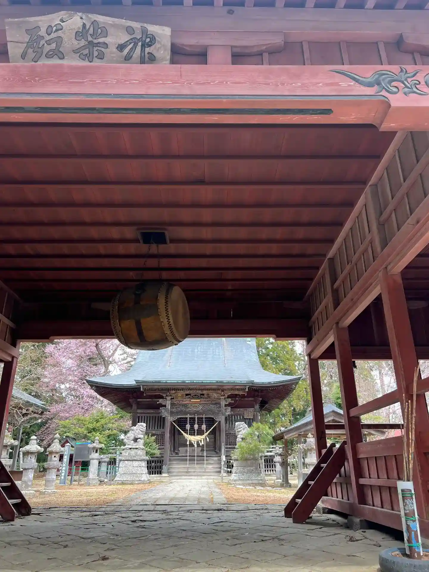 初参拝、R49号から社殿が見えます。参道の桜が七ぶ咲位でした。拝殿までの階段が少し段が高く登り難い感じです。