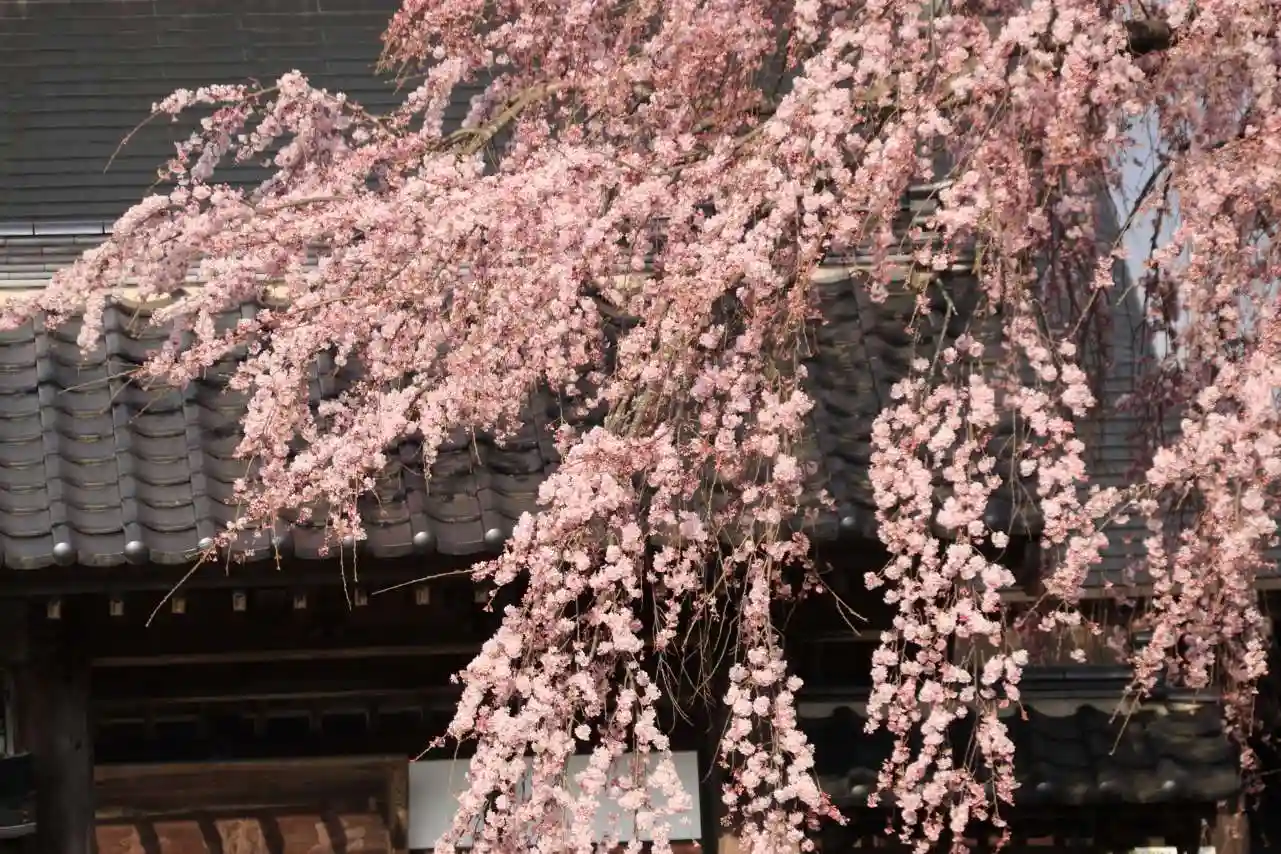 山門の脇に枝垂桜が咲き誇る