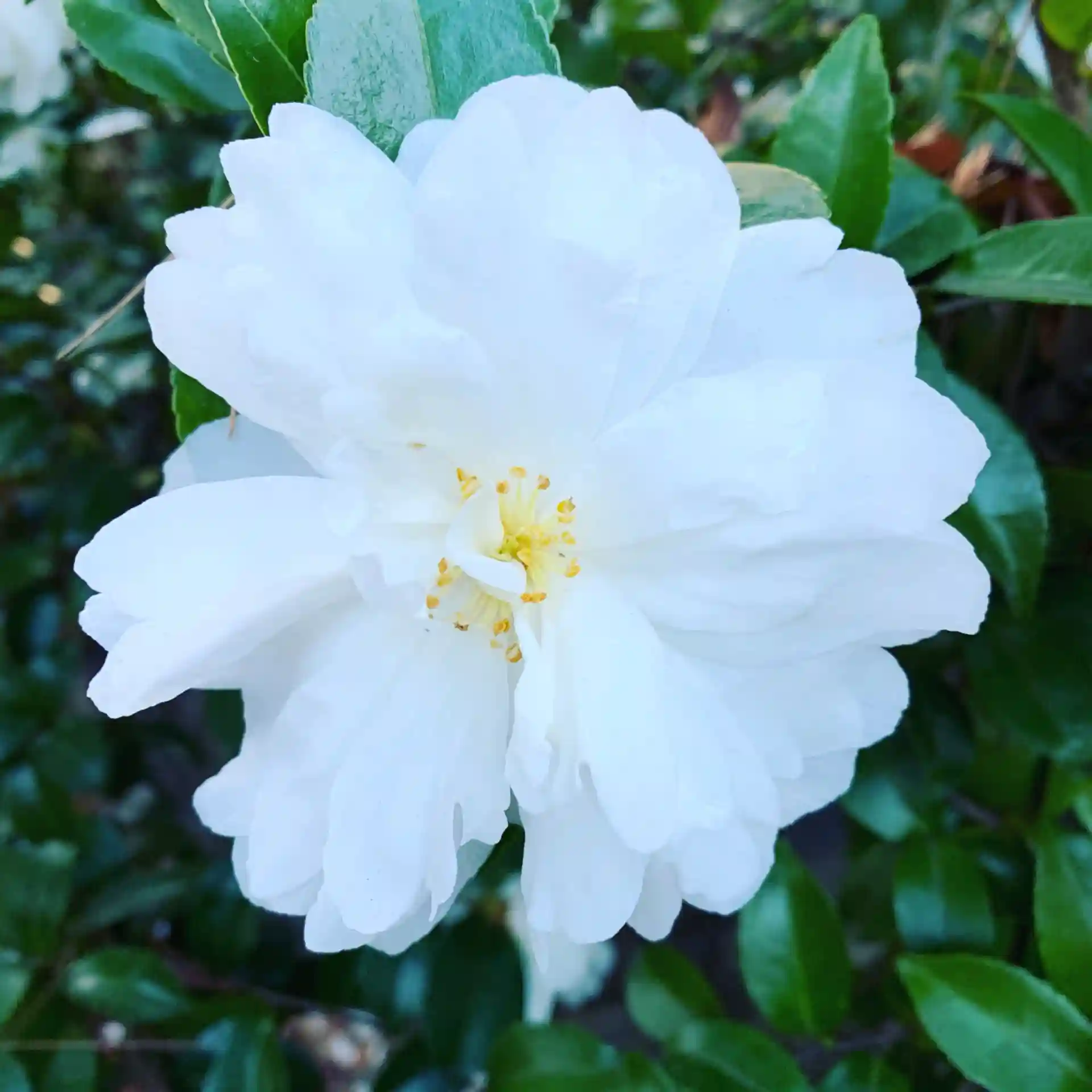 サザンカが雪のように白い花を咲かせています。