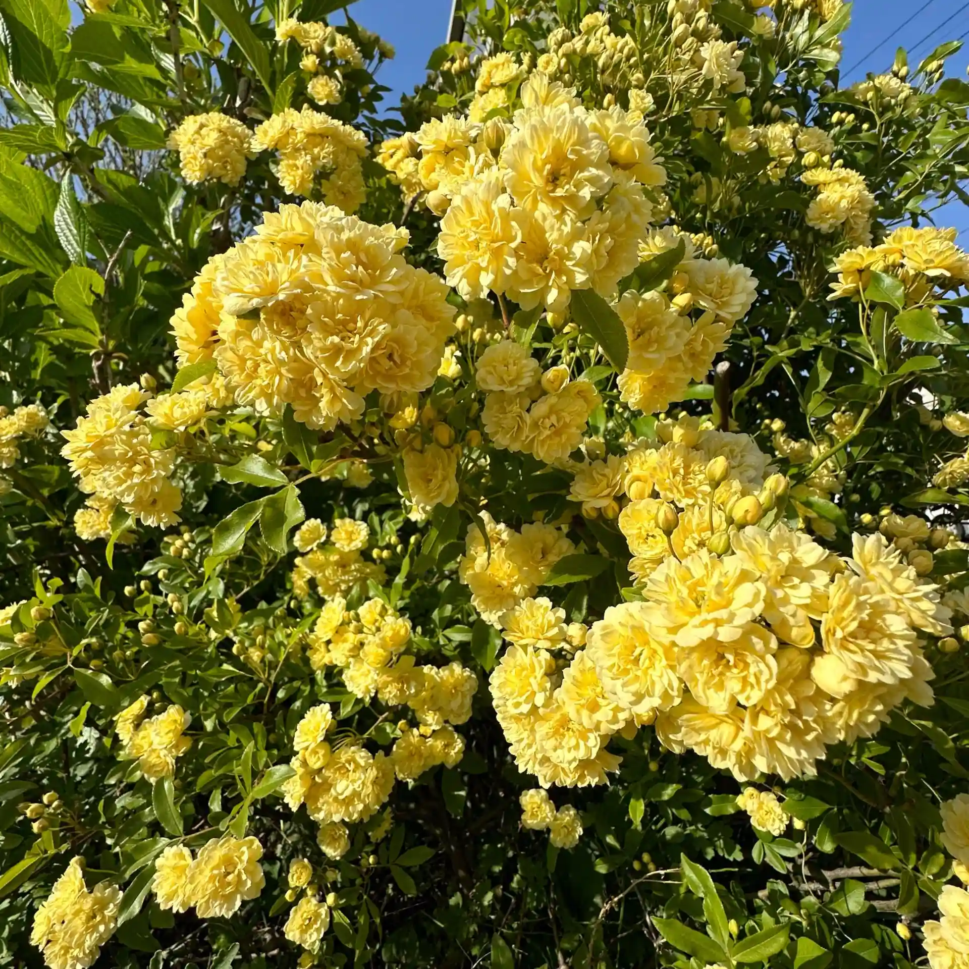 モッコウバラが青空の下木いっぱいに花をつけています。