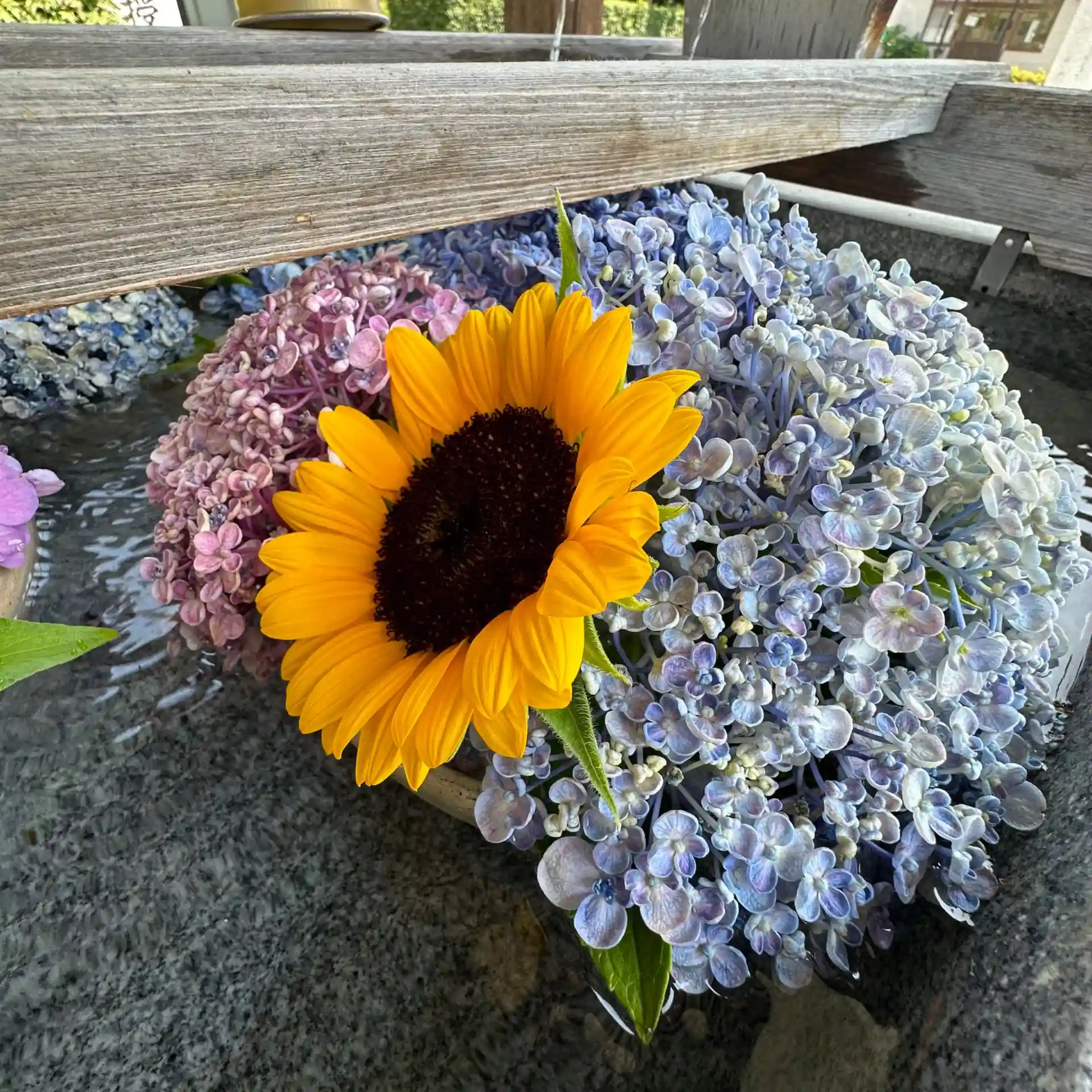 連日の暑さで花の痛みも激しくなりますので来月は花手水をお休みさせていただくこともあるかもしれません。ご理解ください。