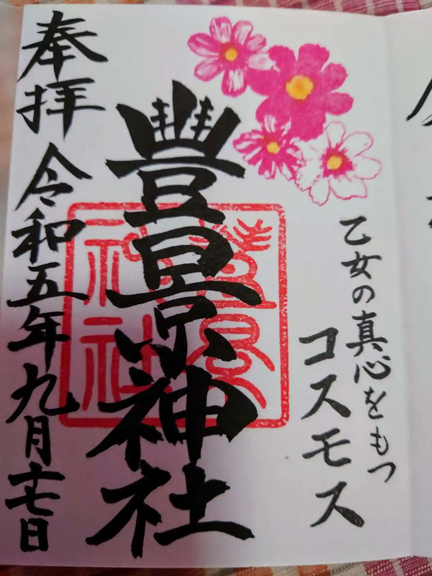 御朱印は種類があり、月替りはどれも欲しくなるくらい彩色が鮮やかでした。額に入って飾ってある切絵にも見惚れてしまいました。9月のコスモスの御朱印と月替りの栞を頂きました。