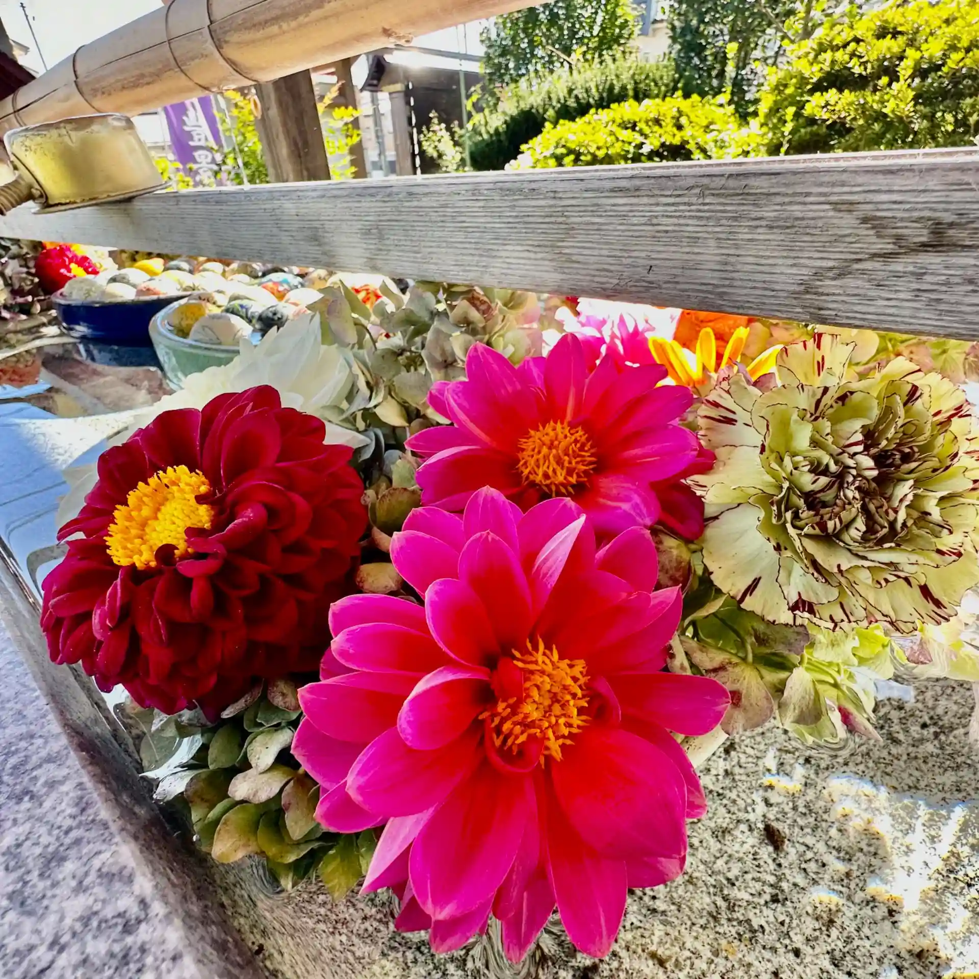 花手水の花が傷んできたので境内のダリアを入れました。