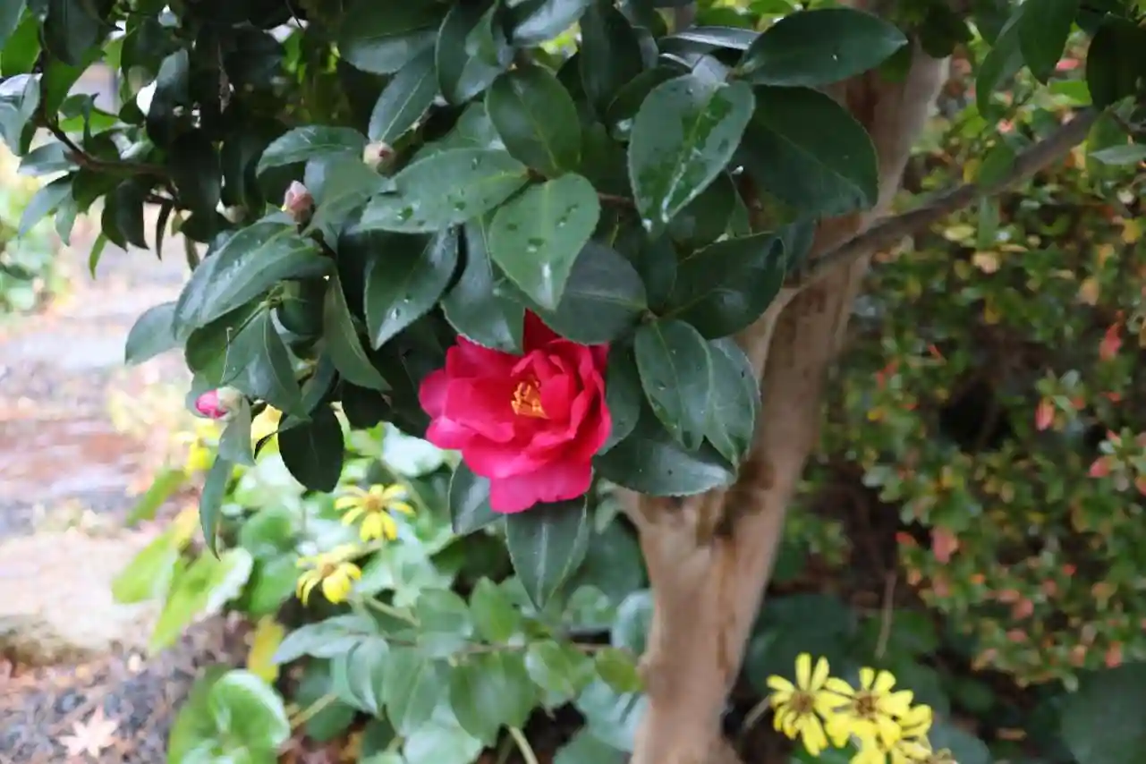 山茶花の咲く参道を進み拝殿でお参り