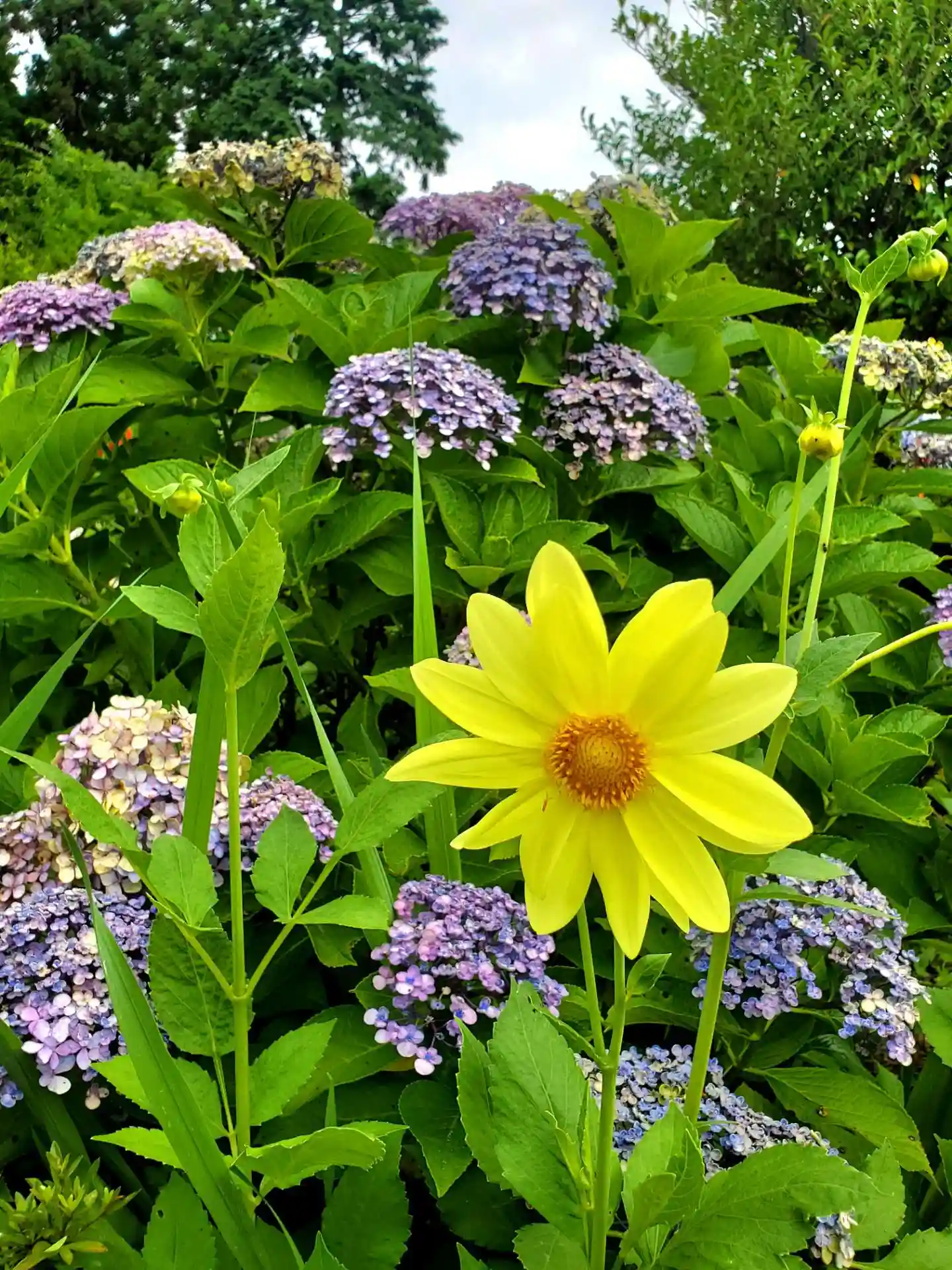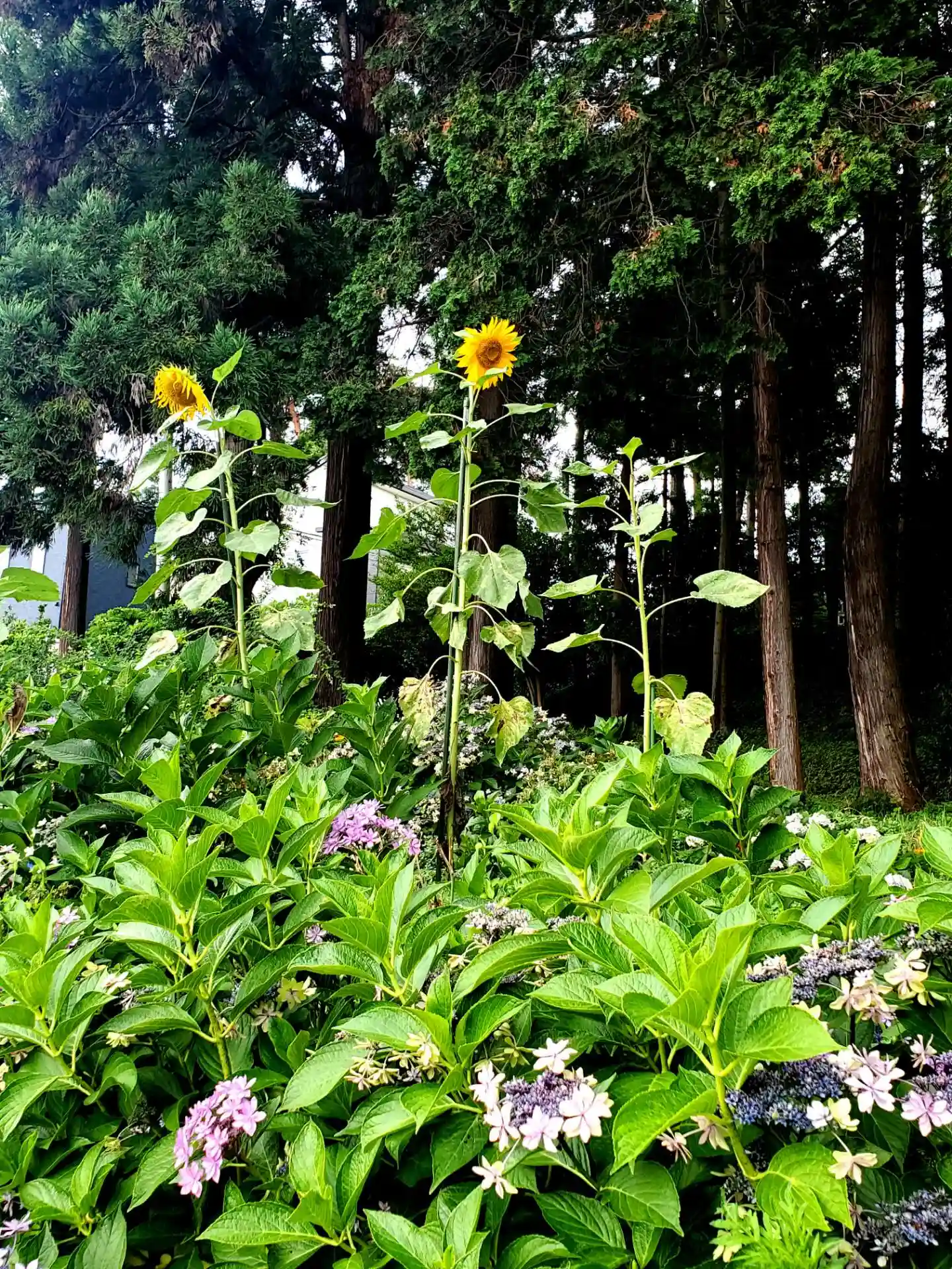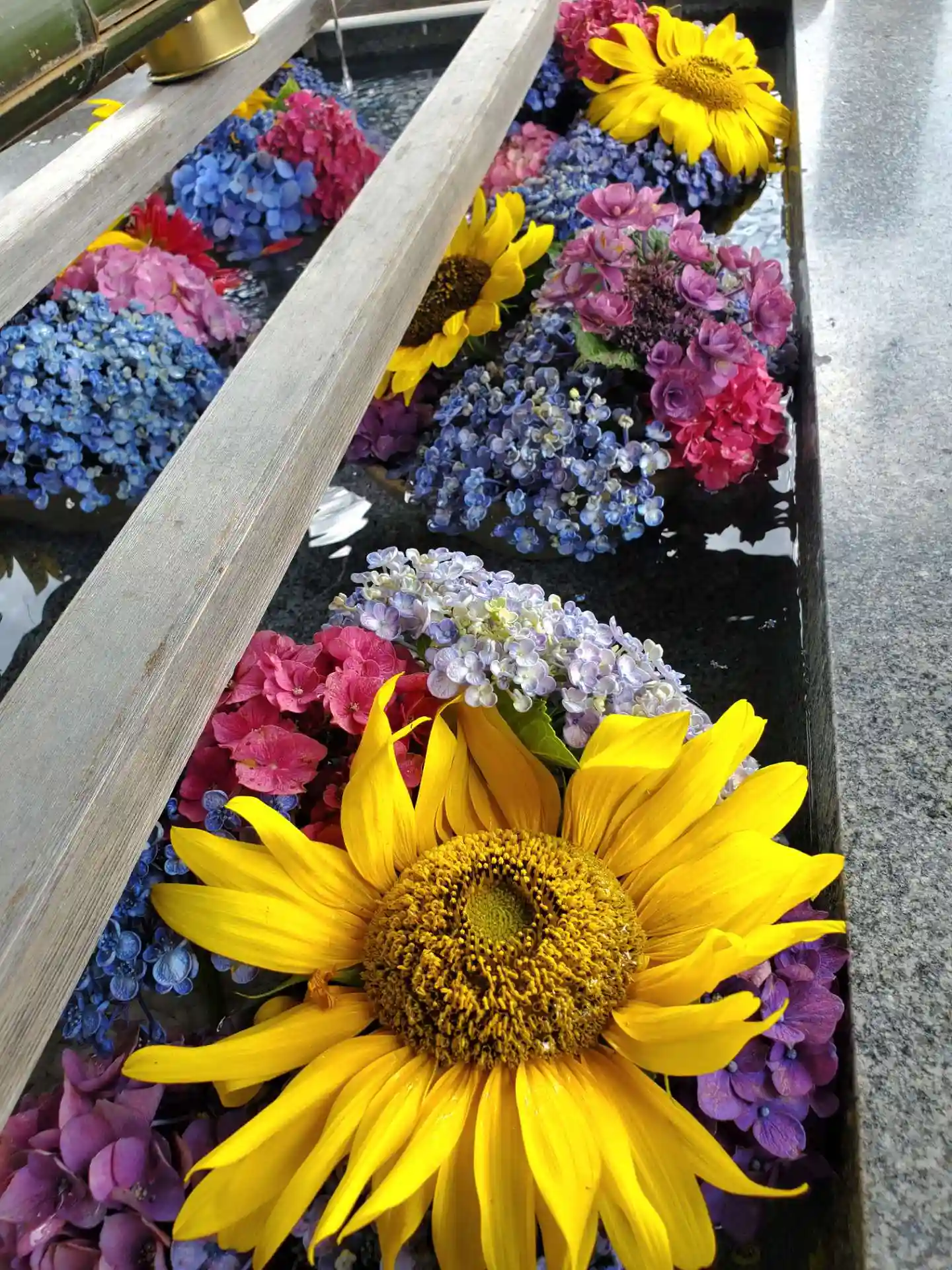 紫陽花と🌻ヒマワリで彩られた花手水は庭で咲くお花のようです😃