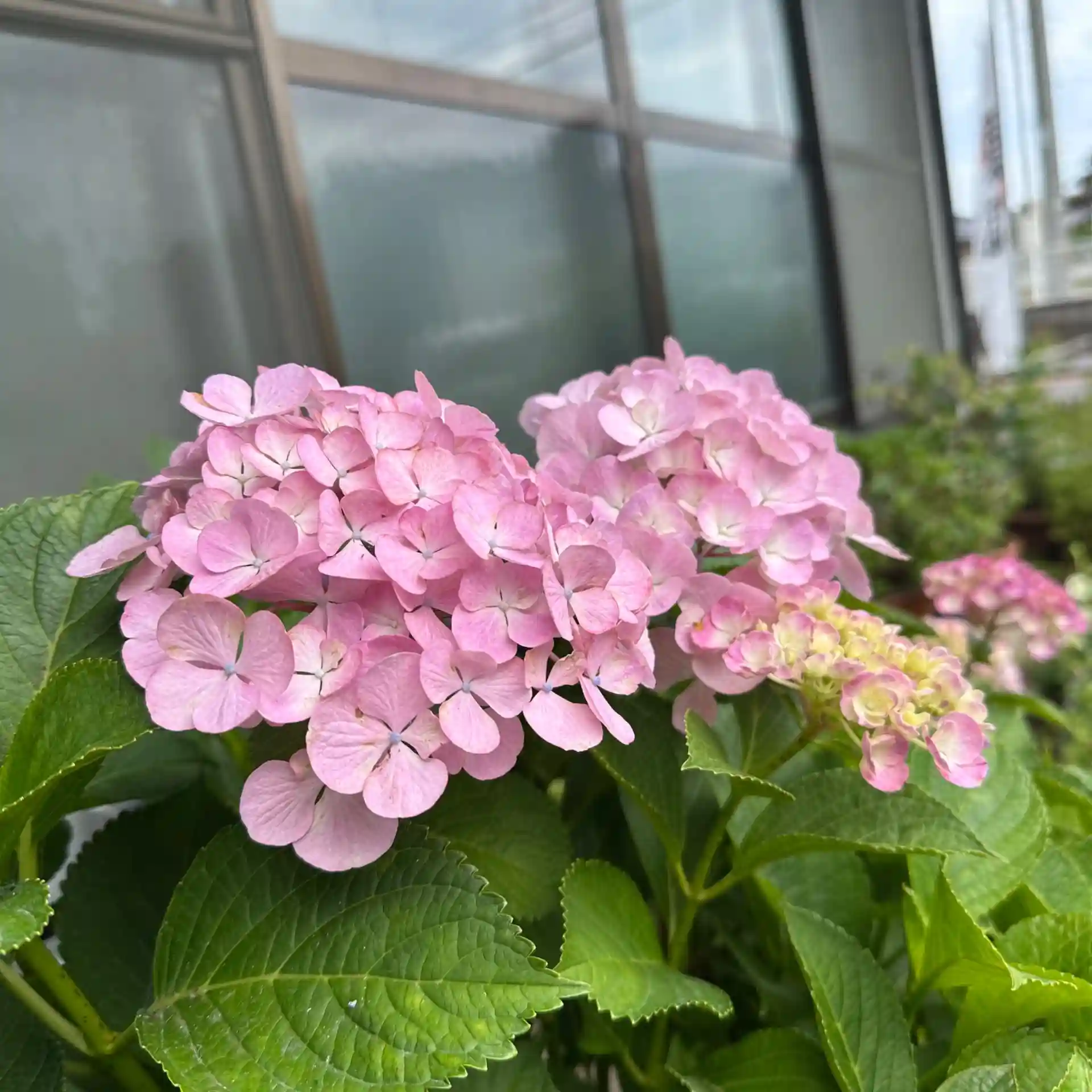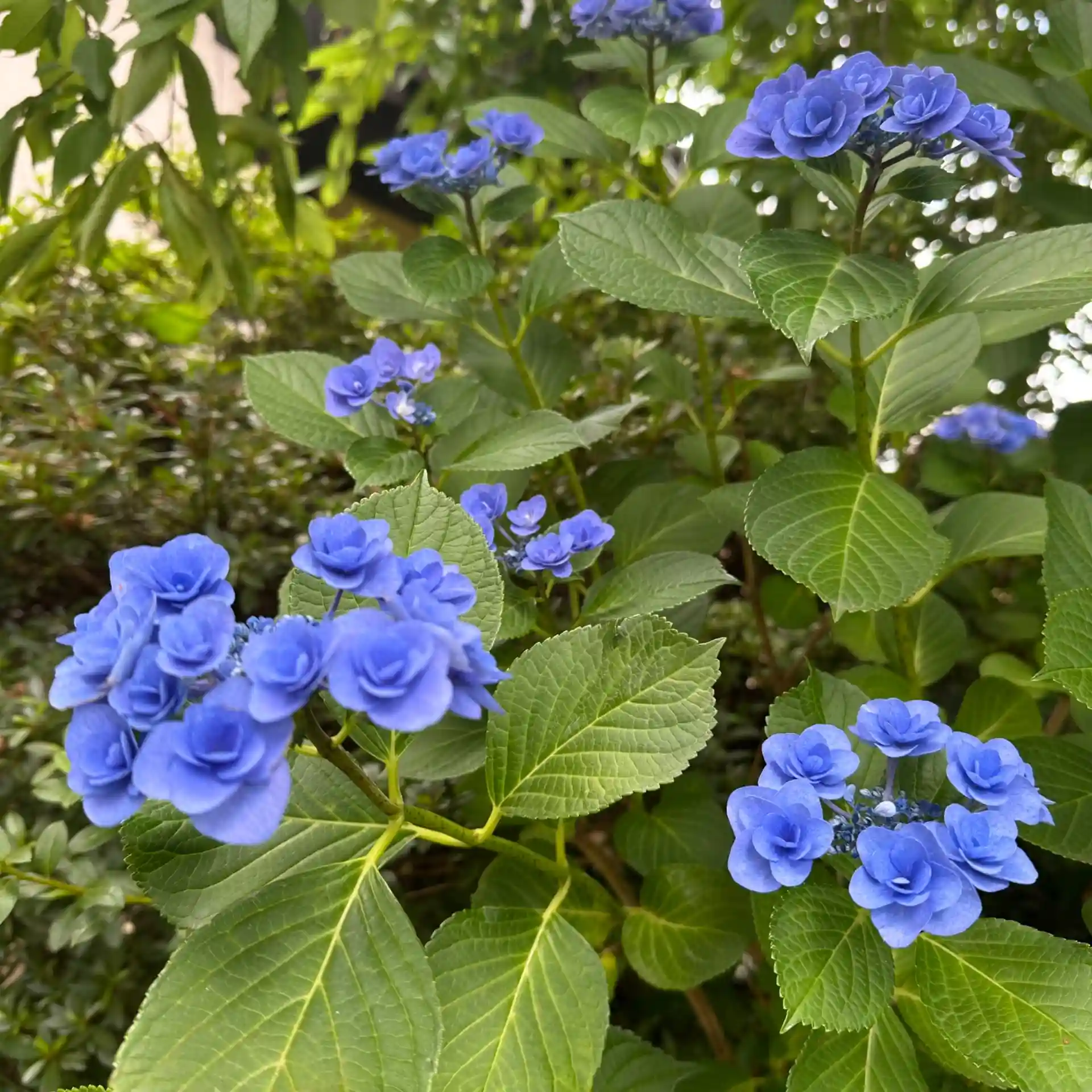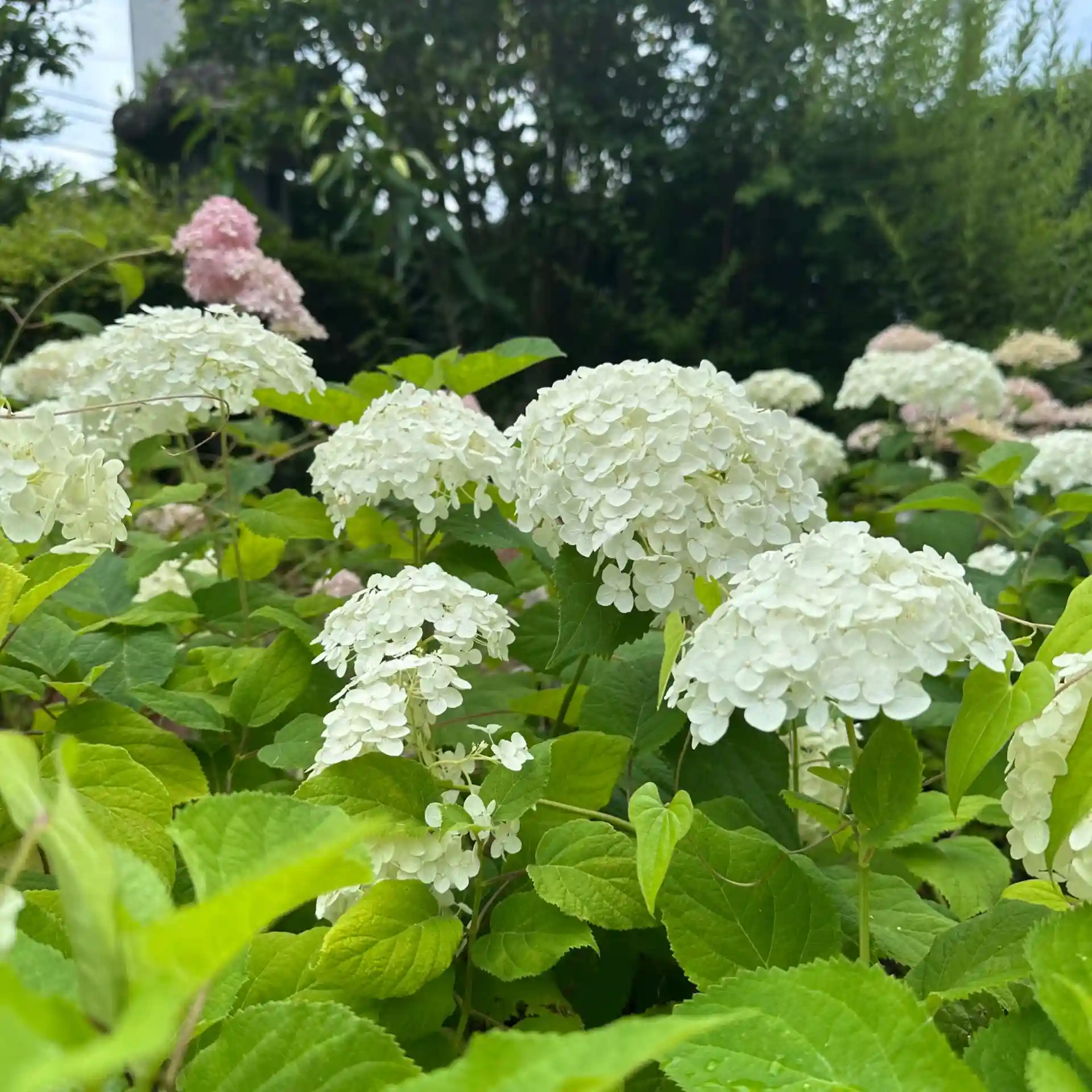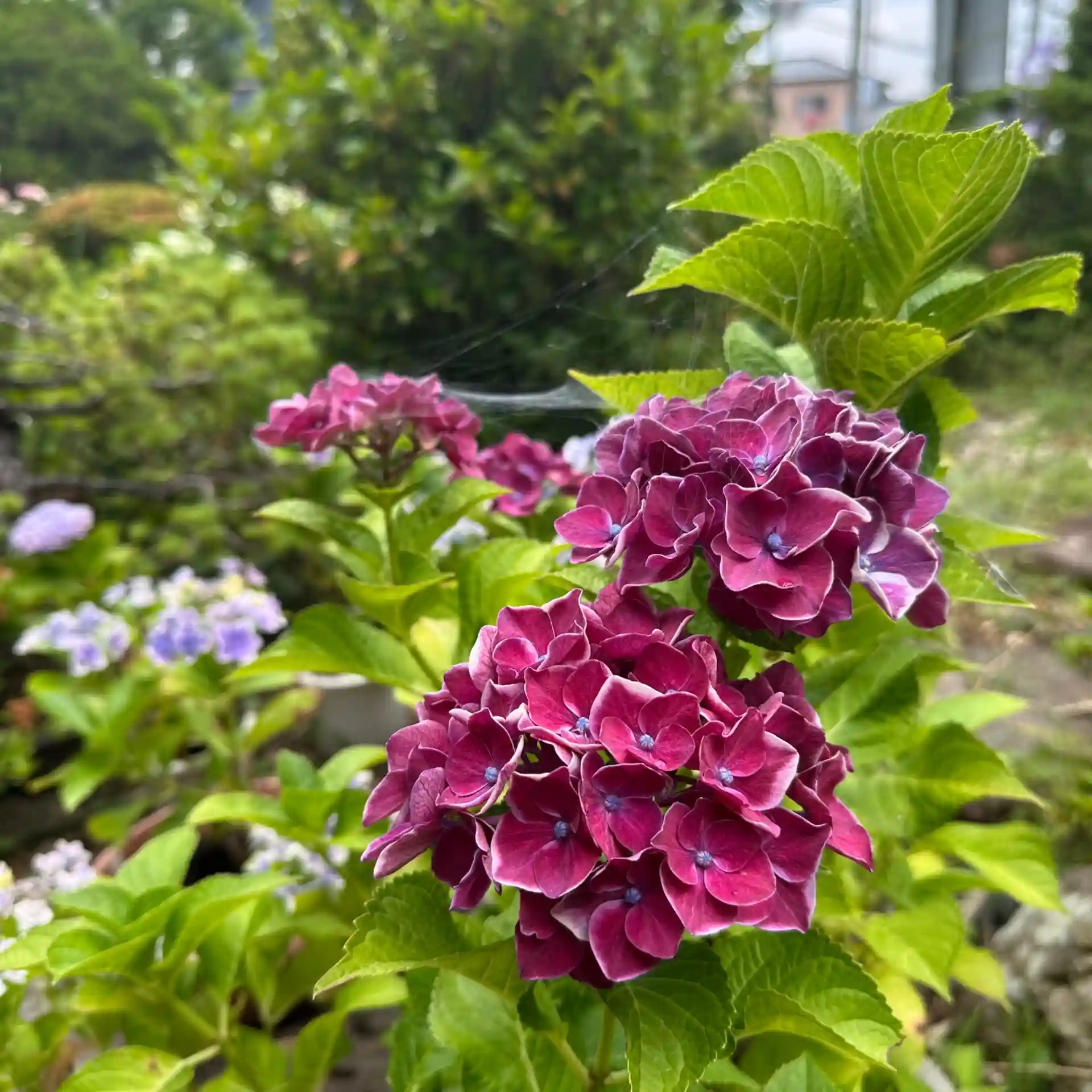 アジサイが色とりどりの花を咲かせ、花手水もアジサイ一色になってます