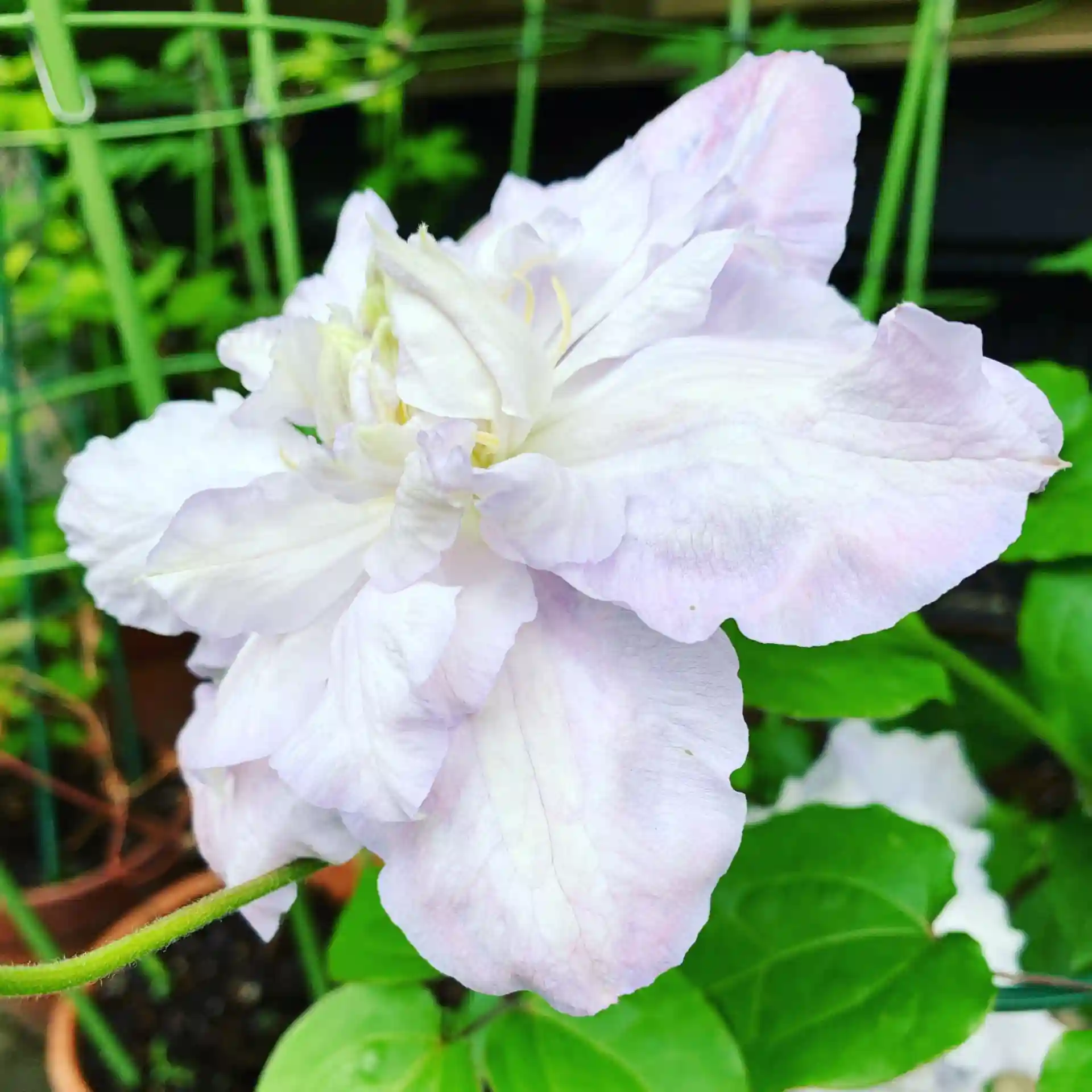 シロのクレマチスが大きな花をつけています。