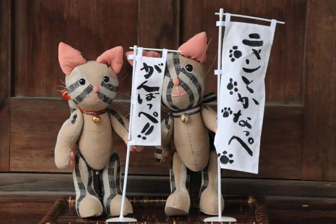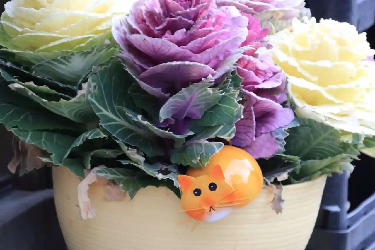 花手水に猫が飾られて
