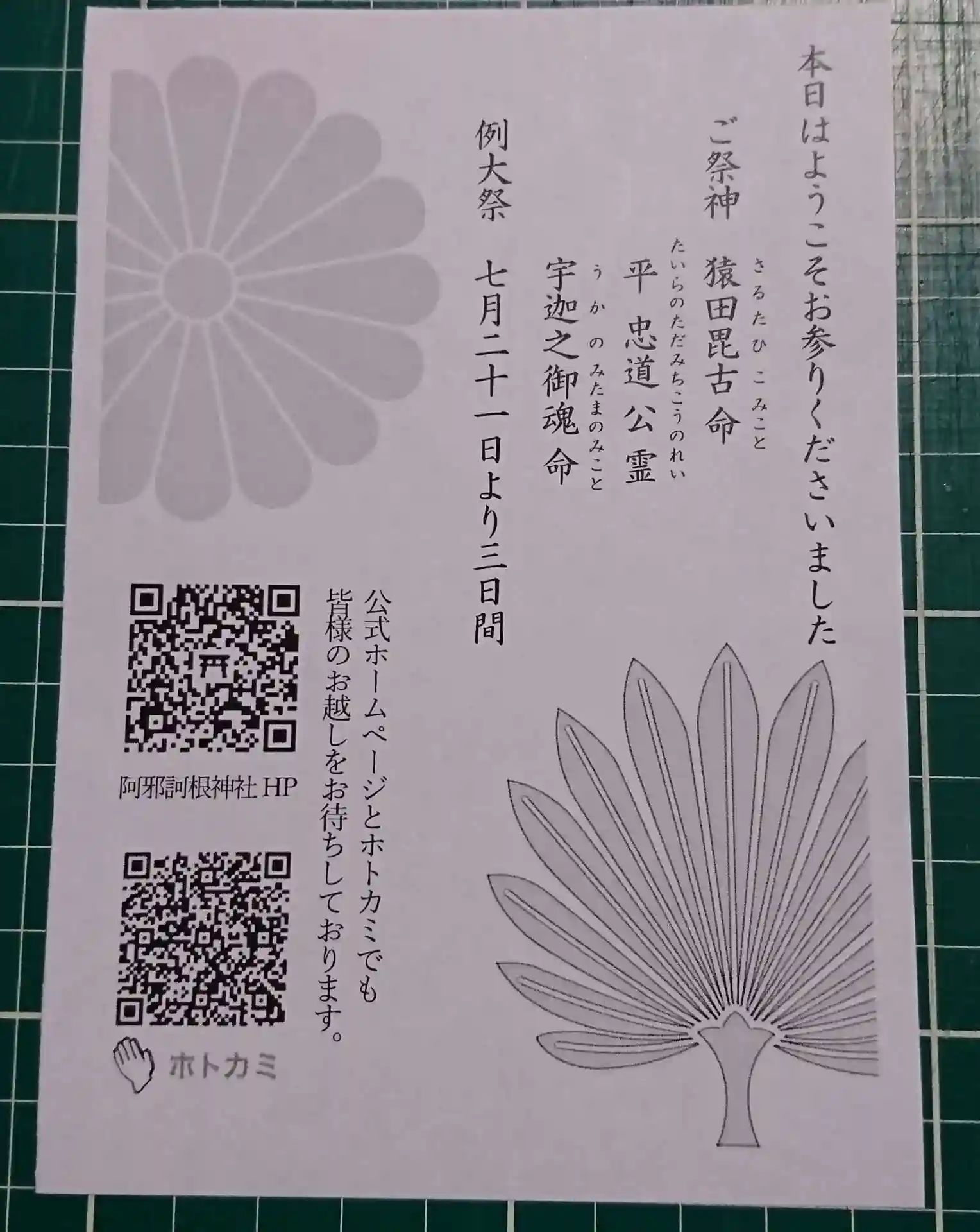ご祭神の猿田毘古命にちなんで羽団扇。