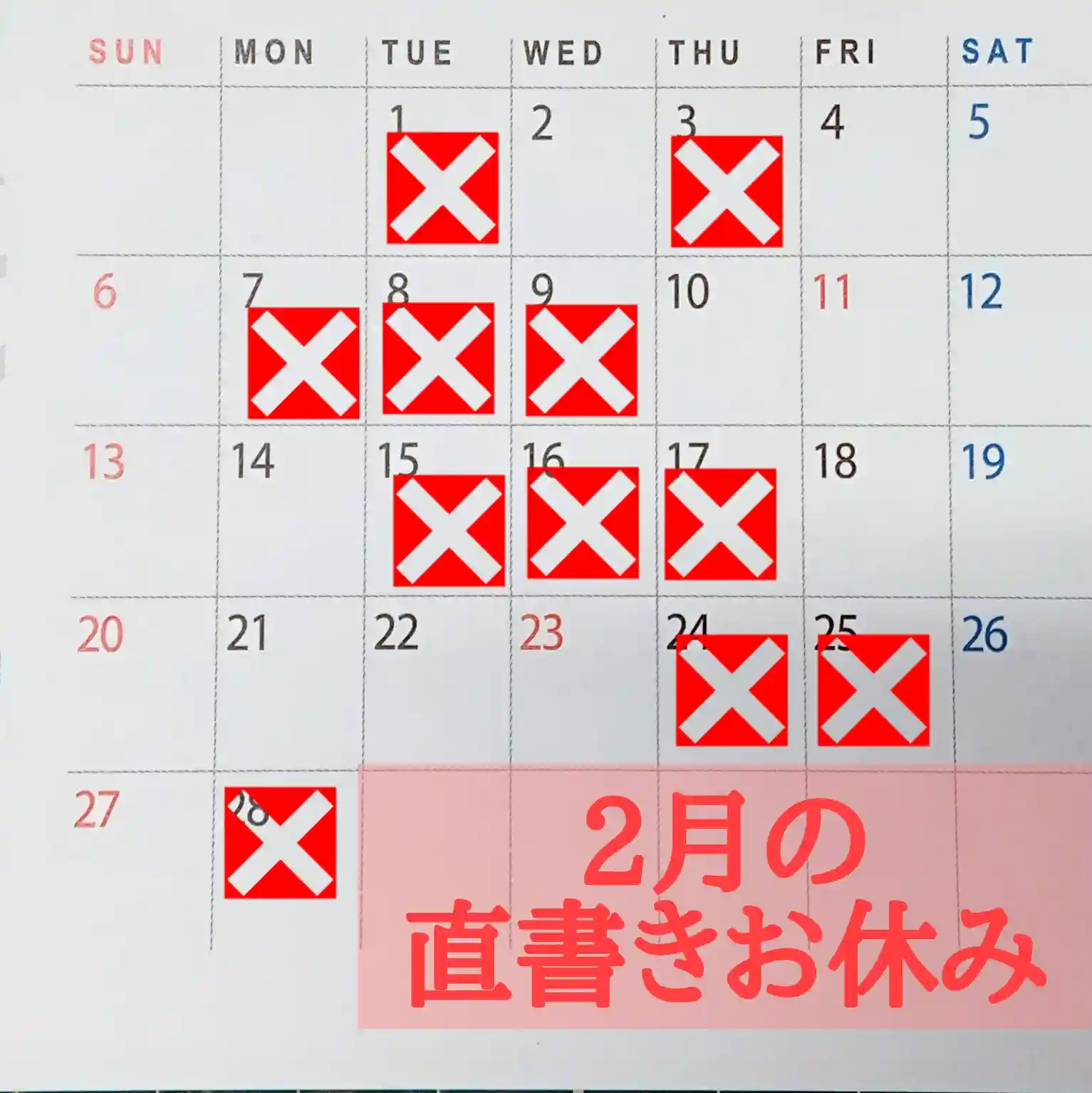 2月の直書きお休みカレンダー🗓