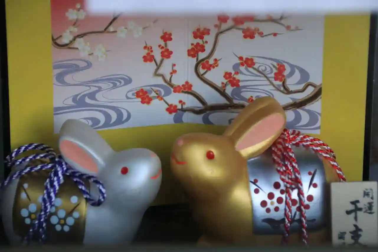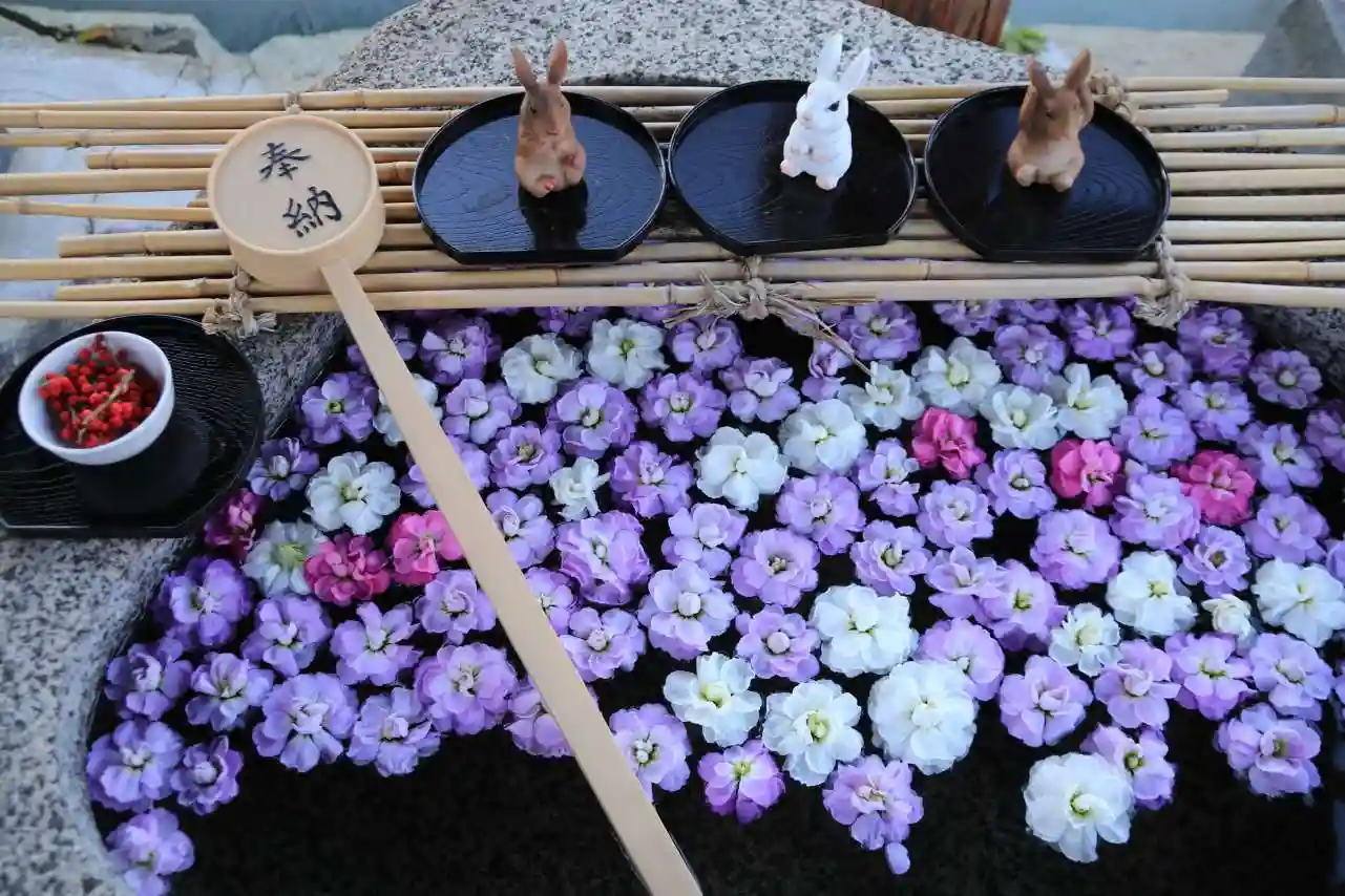 手水舎で兎たちが花見をしていました