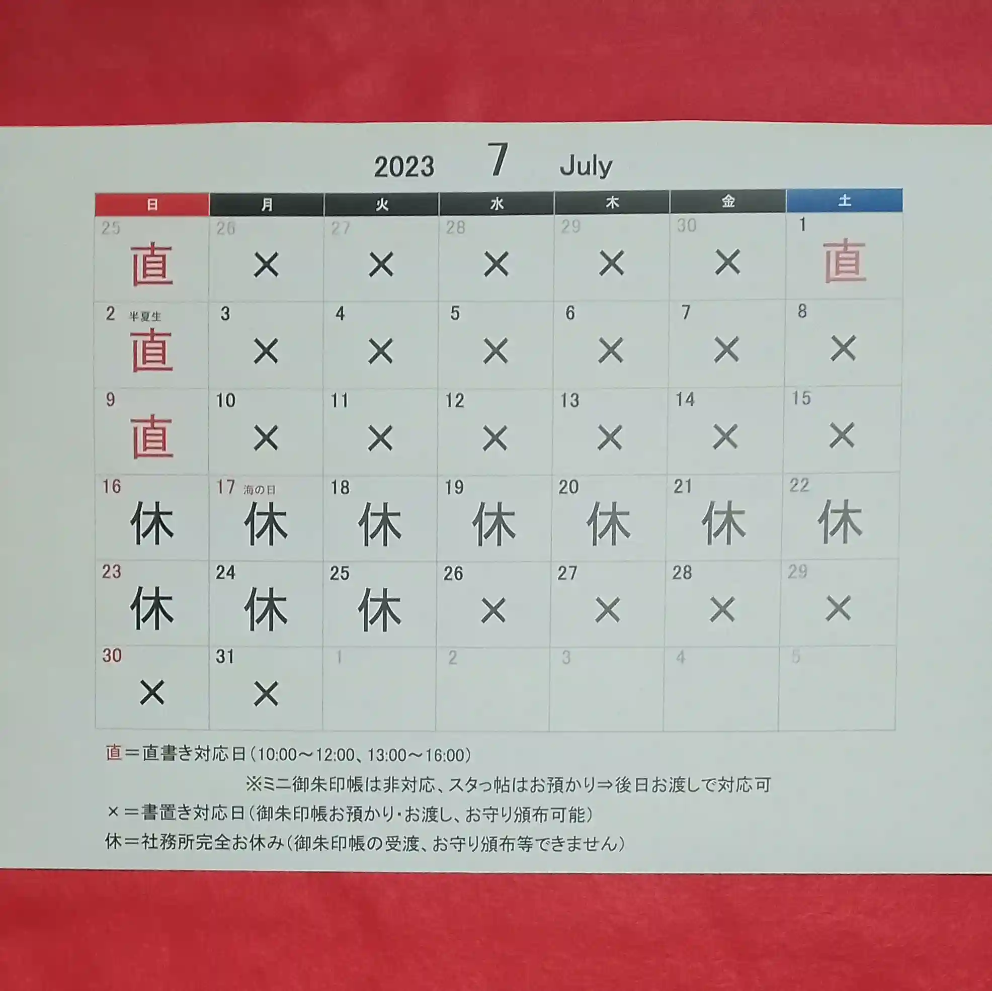 7月の御朱印直書きカレンダーを掲載します。